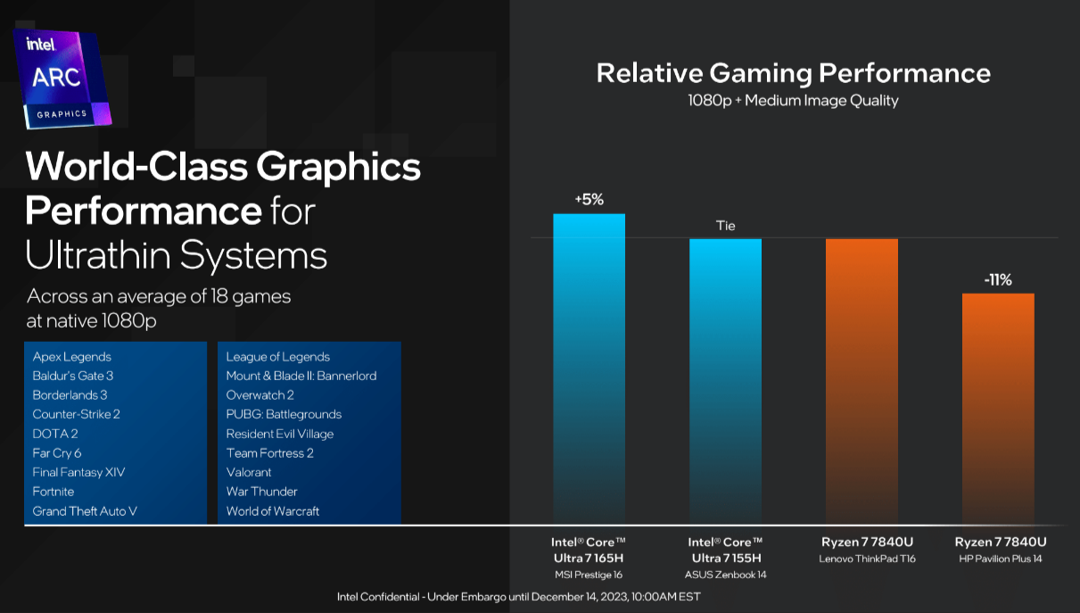 As we noted back at Intel Innovation, the company has been putting a lot of effort into improving its integrated graphics. Some of the new Core Ultra processors will ship with an Intel Arc iGPU with up to 8 Xe-cores, which as we saw in early demos, can run AAA games like Shadow of the Tomb Raider. In additional benchmarks, Intel claims that the new Arc iGPU for Core Ultra CPUs will be capable of running games like Apex Legends, Counter-Strike 2, Baldur's Gate 3, Final Fantasy 14, GTA 5, WoW, LoL, Overwatch 2, PUBG, Resident Evil Village, Valorant and others at native 1080p with at least medium quality settings – which is impressive for a 28W chip aimed at ultrathin laptops.