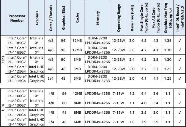 Getting down to the technical details, Tiger Lake (11th Gen Core) leverages Intel's new SuperFin process technology. These CPUs have scalable performance across a 7 to 28 watt thermal envelope. There are 9 configurations in total, which clock speeds ranging from as low as 1.8GHz and going all the way up to a 4.8GHz chip. You can see each SKU and its specs in the table below: