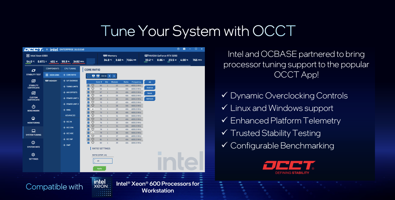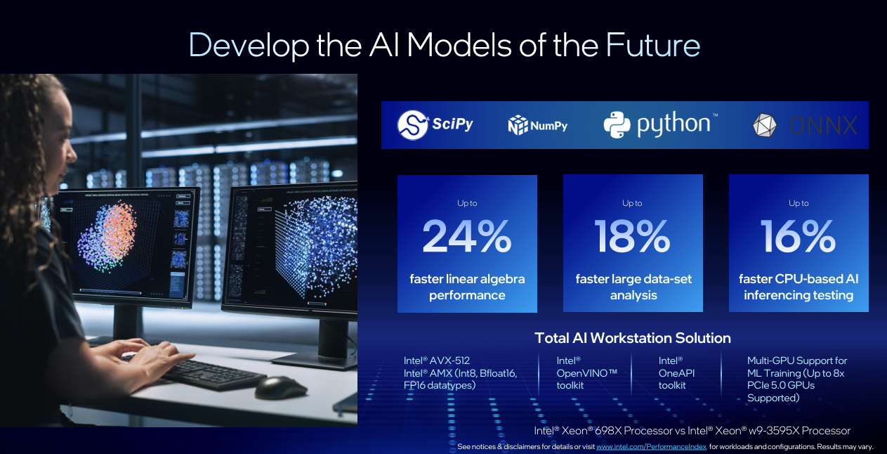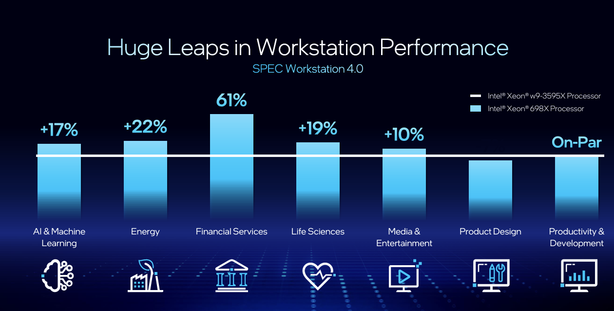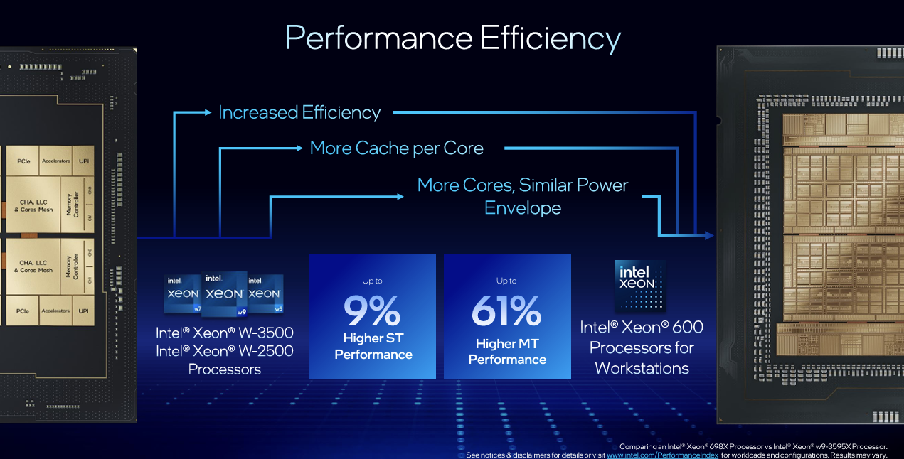Each new Xeon 600 CPU is built using the new Intel 3 manufacturing process, as well as Redwood Cove cores. Intel says this has led to improved power efficiency versus the previous generation Sapphire Rapids Xeon processors. Compared to the 60-core Xeon W-3595X, Intel reports up to 9% higher single-thread performance and up to 61% higher multi-thread performance, depending on workload.