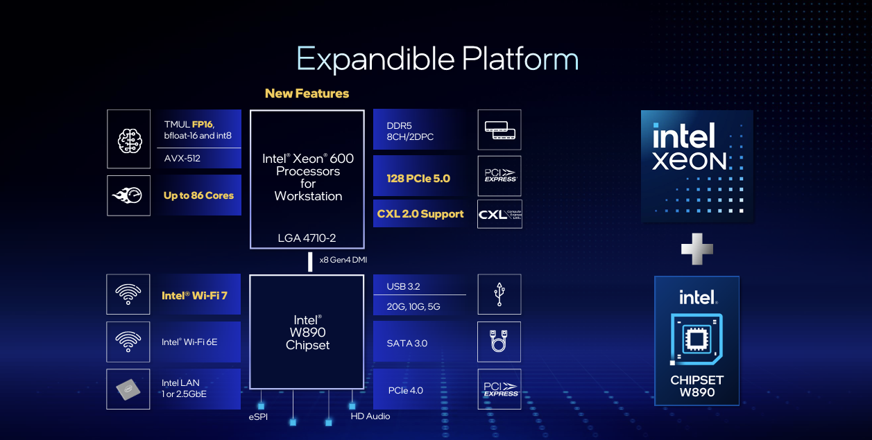 Alongside the new Xeon 600 series CPUs is the W890 chipset, which adds new features like WiFi 7, faster USB, PCIe Gen 4 expansion and more.