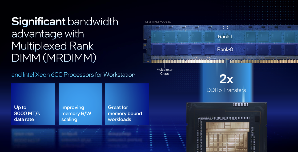 Intel is also introducing MRDIMM (Multiplexed Rank DIMM) support with this new line-up, enabling memory speeds of up to 8000MT/s on select SKUs. While MRDIMMs trade maximum capacity for bandwidth, Intel says they deliver meaningful gains for memory-bound workloads such as simulations and data analytics.