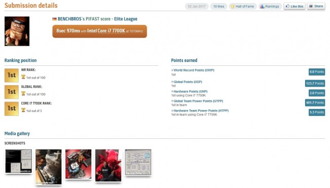 BenchBros broke the world record for the Pifast benchmark, running the 7700K at 7070MHz, completing the benchmark in 8.97 seconds. In the SuperPi benchmark, the chip ran at 7030MHz and completed its run in 4 minutes and 22.54 seconds. This frequency was achieved using liquid nitrogen but according to the team, 5GHz is actually easily achievable on air with Kaby Lake.