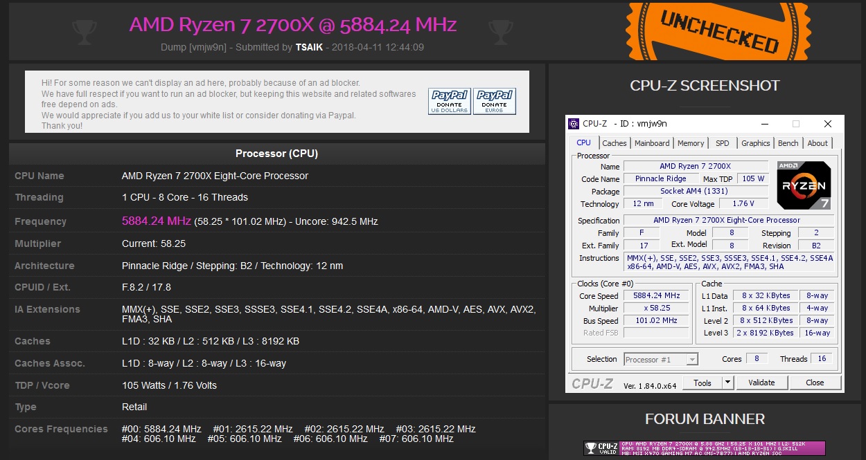 Over on the CPU-Z validation website, two recent overclock results from ‘TSAIK' popped up. One for the Ryzen 7 2700X, which was pushed all the way up to 5884.24MHz and one for the Ryzen 5 2600X, which ended up hitting 5882.97MHz. In both cases, all cores were enabled, in addition to SMT.