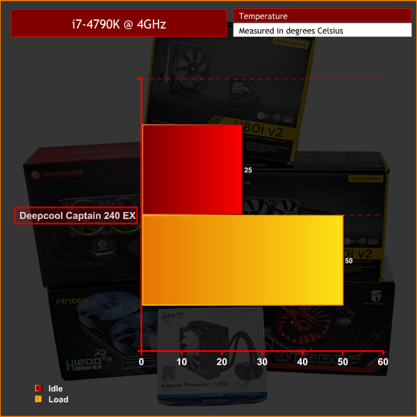 For a 240mm radiator, the Captain 240 EX performs very similarly to the other AIOs on test. Its highest temperature at stock speeds, though, was just 50 degrees – only one degree warmer than the H100i V2.