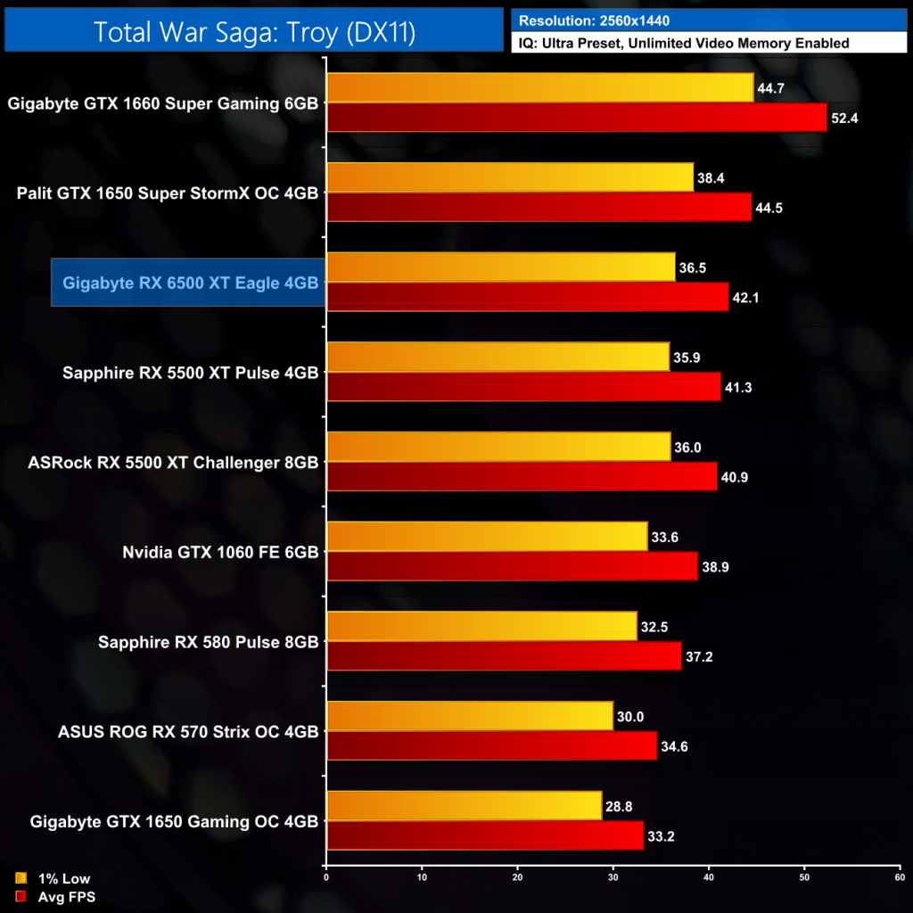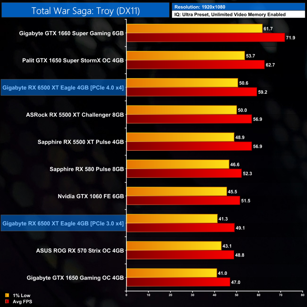 Likewise, for our penultimate game test we come to Total War Saga: Troy. Performance isn't too bad at first glance, the 6500 XT is still slower than the 1650 Super but it’s averaging just under 60FPS which is always a good start. PCIe 3.0 lops off 17% of the performance though, at which point you are once more better off with a GTX 1060, while an RX 570 also delivers the same average performance but with slightly better 1% lows.