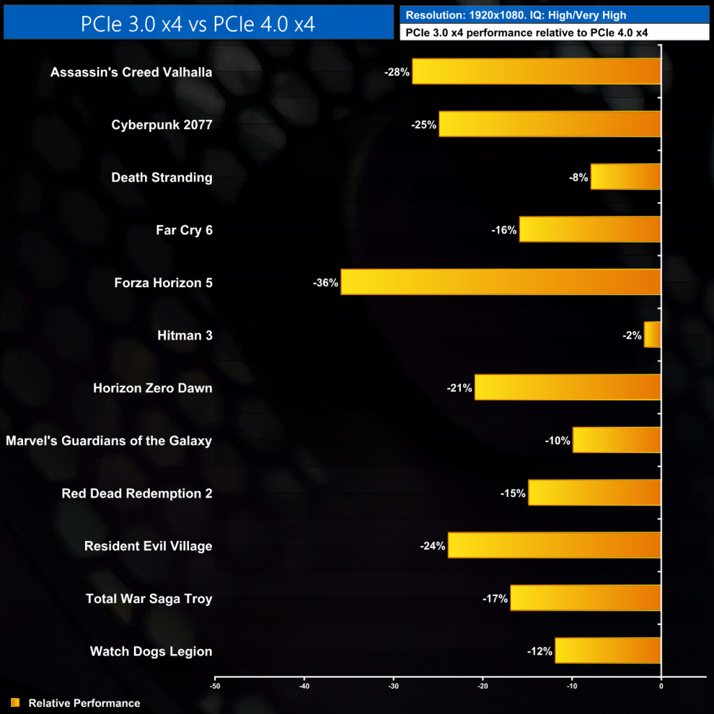 The results are not pleasant viewing. Apart from Hitman 3, where we saw basically no difference between the two PCIe modes, the RX 6500 XT shows clear performance deficits when ran at PCIe 3.0. Forza Horizon 5 is the worst offender, showing a 36% deficit in PCIe 3.0 versus PCIe 4.0, but ten of the twelve games we tested also show double-digit performance losses.