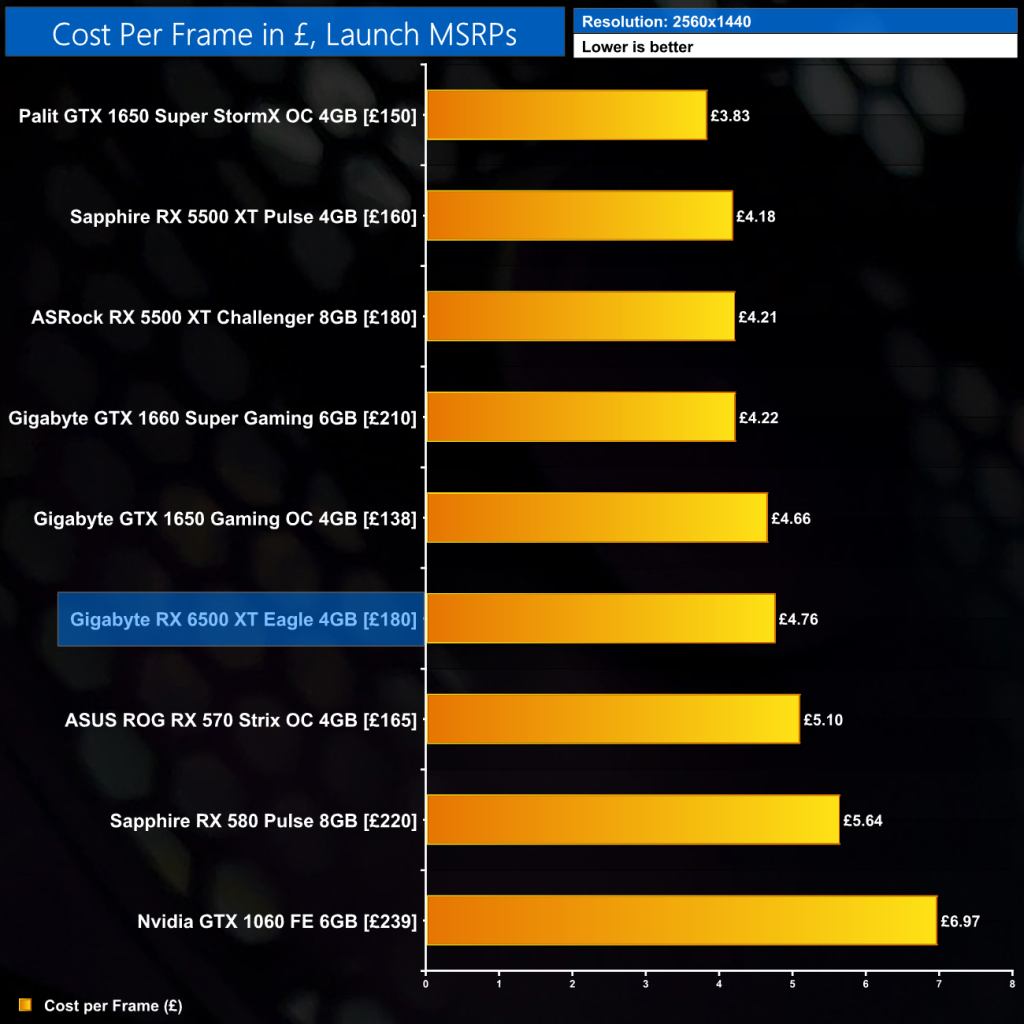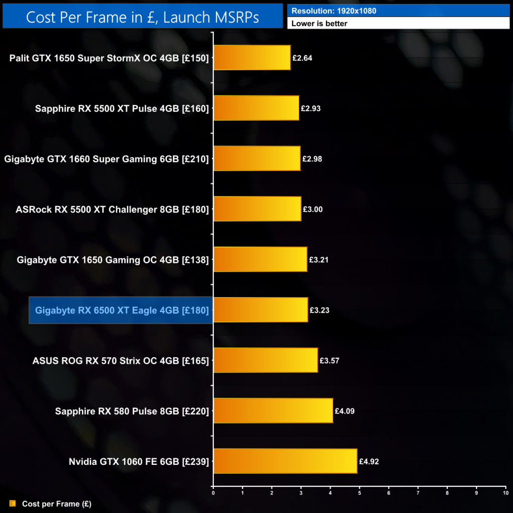 For a quick look at cost per frame, these values are calculated with launch MSRPs, so their usefulness is mainly ‘academic' at this point. We've already seen rumours of the RX 6500 XT retailing for well over the $199 MSRP, but even taking that figure at face value it offers worse value than the GTX 1650, GTX 1650 Super, GTX 1660 Super, RX 5500 XT 4GB and RX 5500 XT 8GB…
