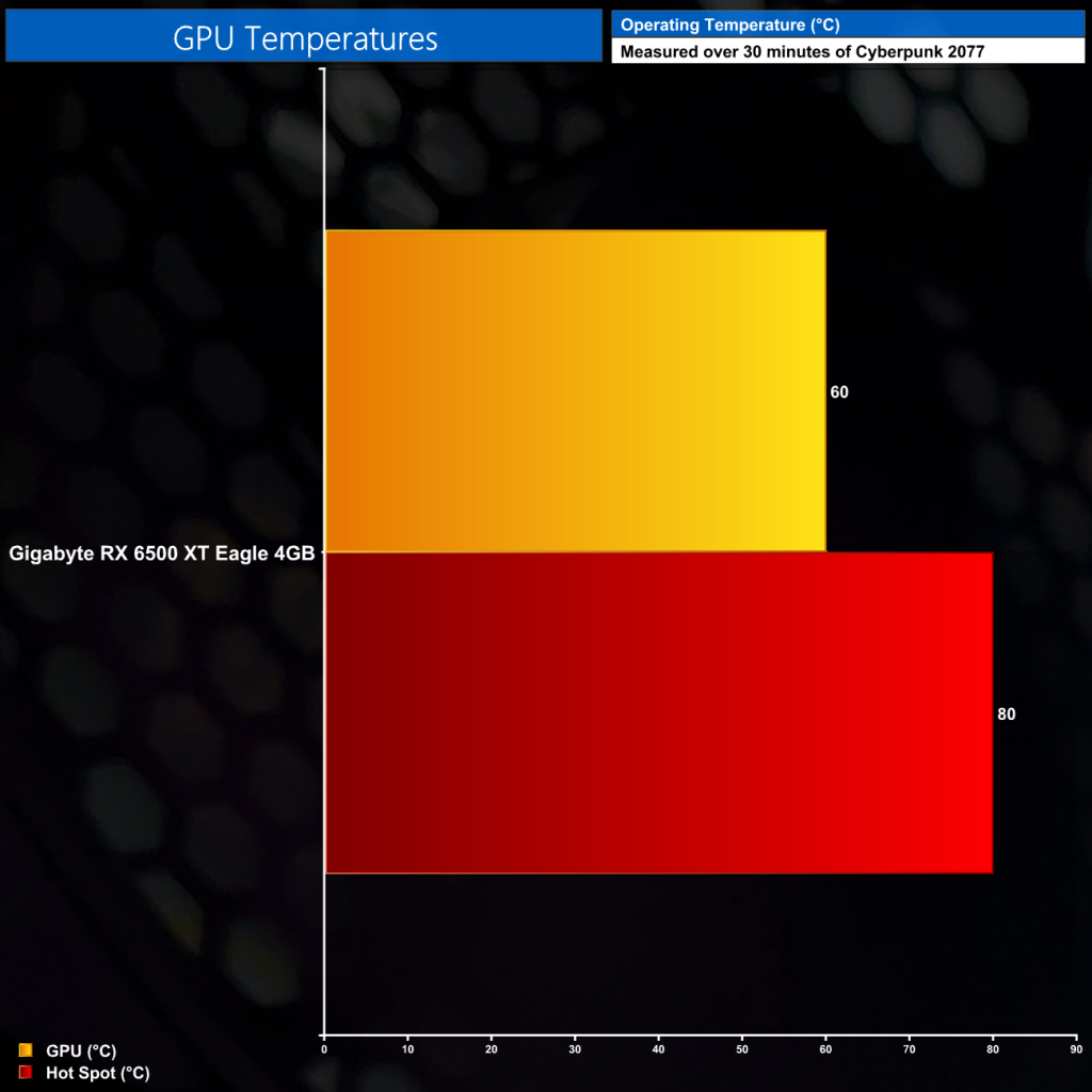 We've only tested the one RX 6500 XT model, but we can't complain at all about the Eagle's thermal performance – the GPU peaked at just 60C, with the hot spot at 80C.