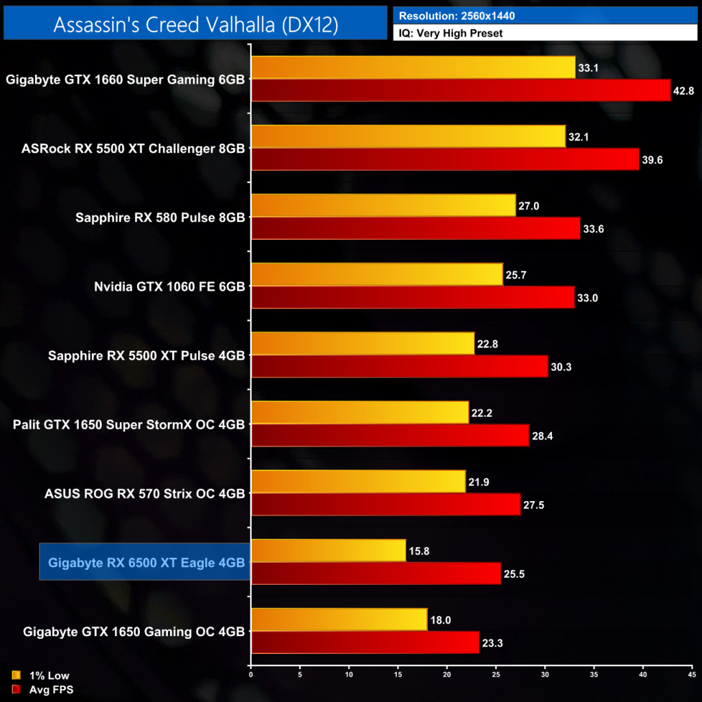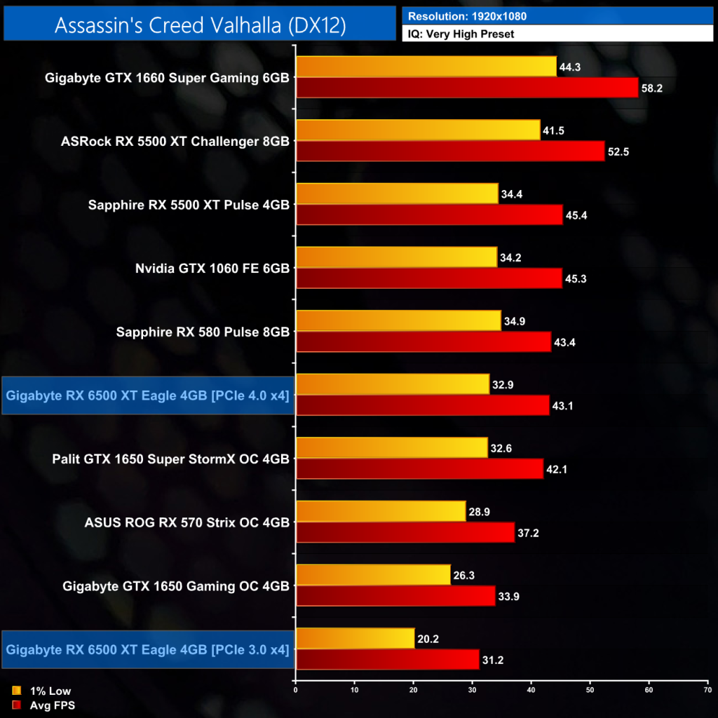 It’s a pretty poor start for the 6500 XT in Assassin’s Creed Valhalla. Performance is basically identical to an RX 580 and is actually slower than the GTX 1060, with AMD's latest GPU delivering 43FPS on average. Dropping down to PCIe 3.0, however, delivers a hammer blow for the 6500 XT, as the frame rate drops to just 31FPS, making it slower than even the lowly GTX 1650.