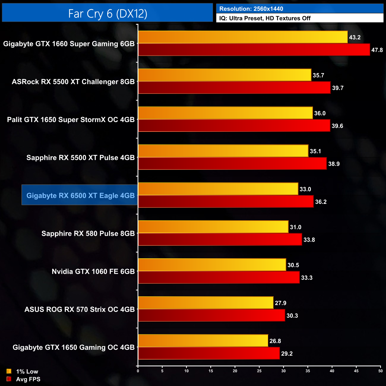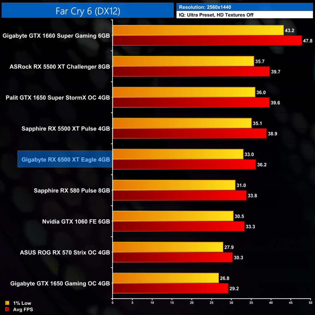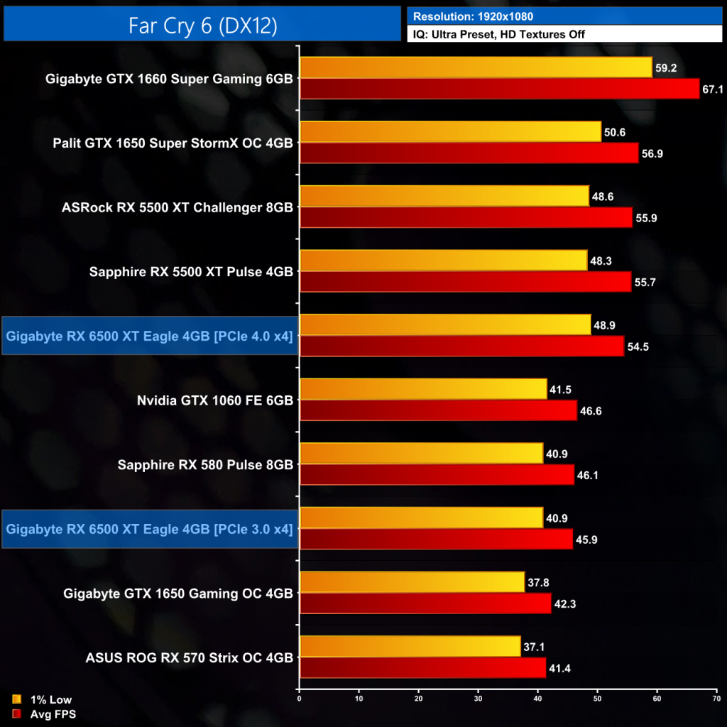 Next is Far Cry 6 and would you believe it, the 6500 XT is actually faster than the RX 580 here, delivering about 55FPS on average. It’s no better than the 5500 XT however, and actually when we do test with PCIe 3.0 speeds, performance is back at RX 580 levels. It's hardly great progress.