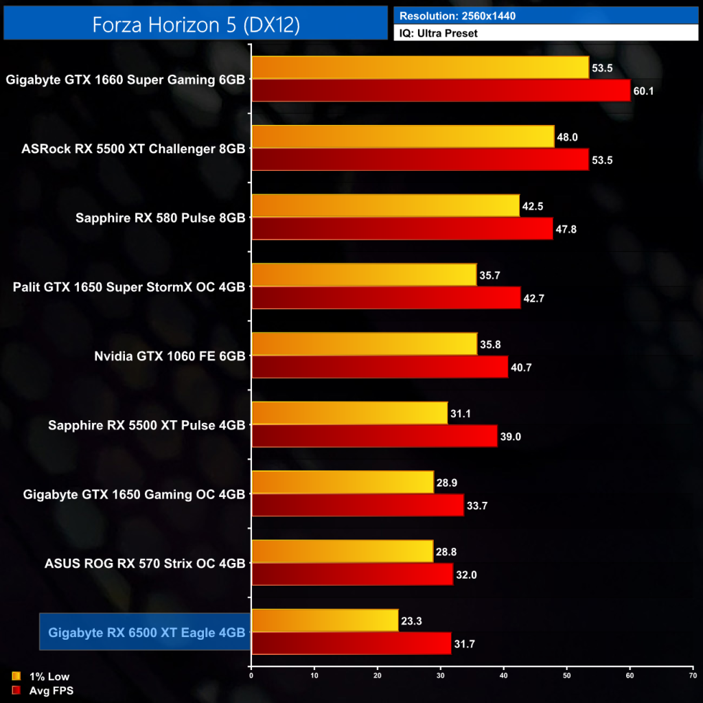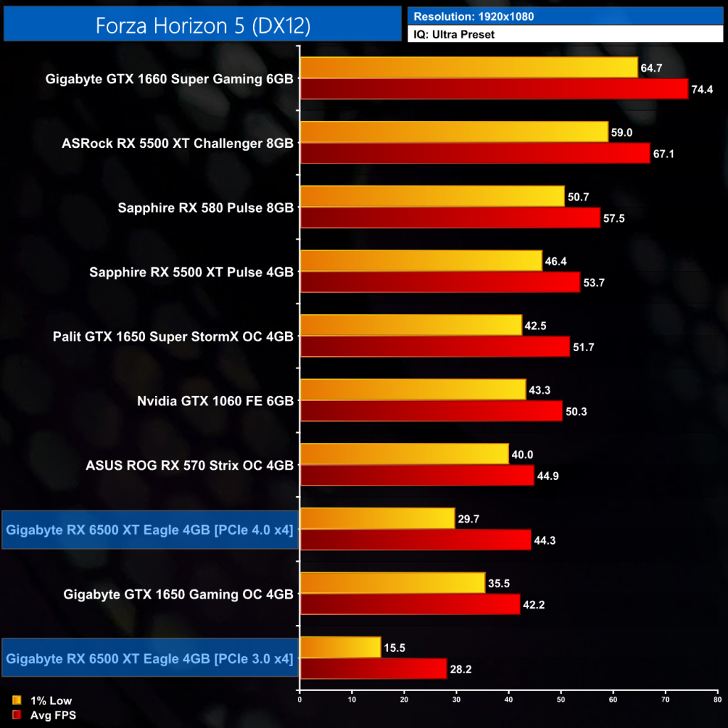 As for Forza Horizon 5, this game perfectly illustrates the fundamental flaws of the 6500 XT. We know it’s a very VRAM-hungry title, but if you look at the data above, the 4GB 5500 XT is still delivering solid performance at these settings. In what’s likely a combination of the four PCIe lanes and incredibly limited memory bandwidth however, the 6500 XT performance drops off a cliff, and then drops off another one when we test with PCIe 3.0.