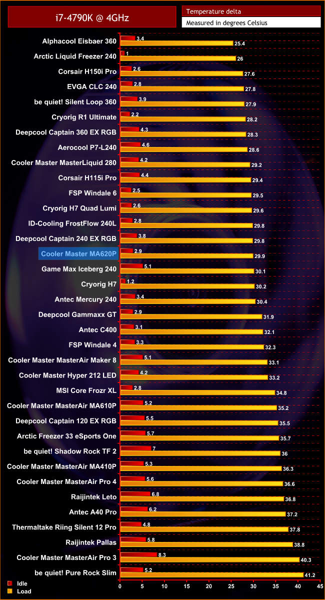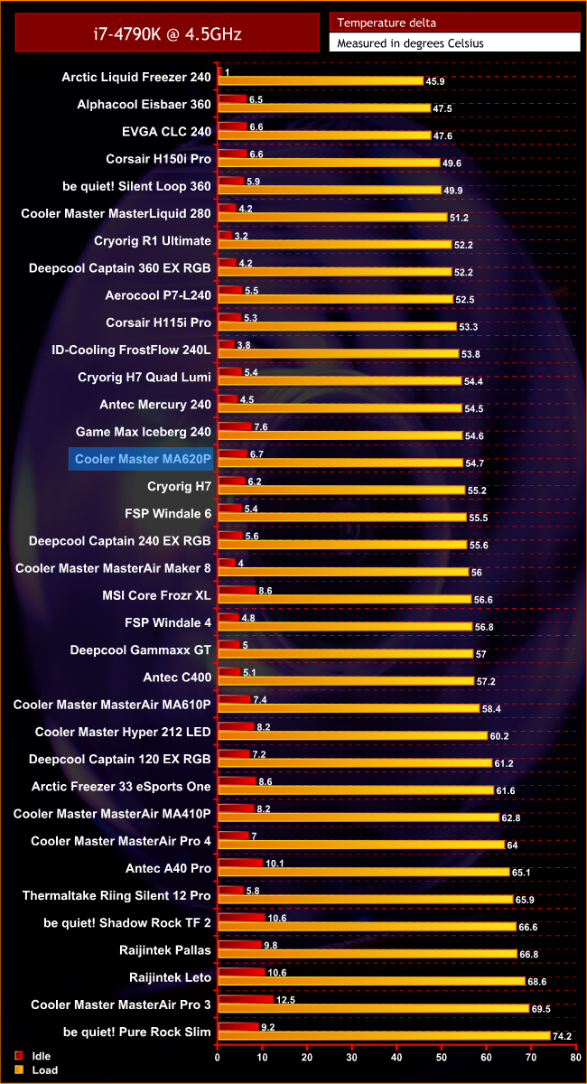 It also beats a couple of liquid coolers as well – the Deepcool Captain 240 EX RGB, for instance, can't cool as well. Overall, the MA620P is Cooler Master's best performing air cooler that I have seen to date.