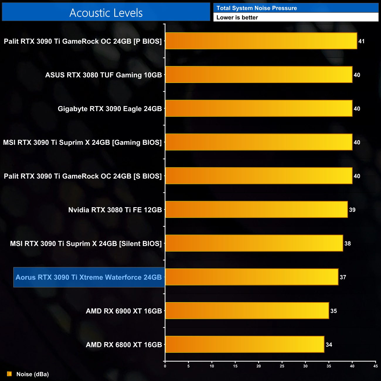 Thankfully, the Xtreme Waterforce is nice and quiet, hitting just 37dBa on our sound meter. That was with the fans spinning at 39%, or 1115rpm, and to my ear there was no audible pump whining either, so we can no complaints about noise from any area of the card.