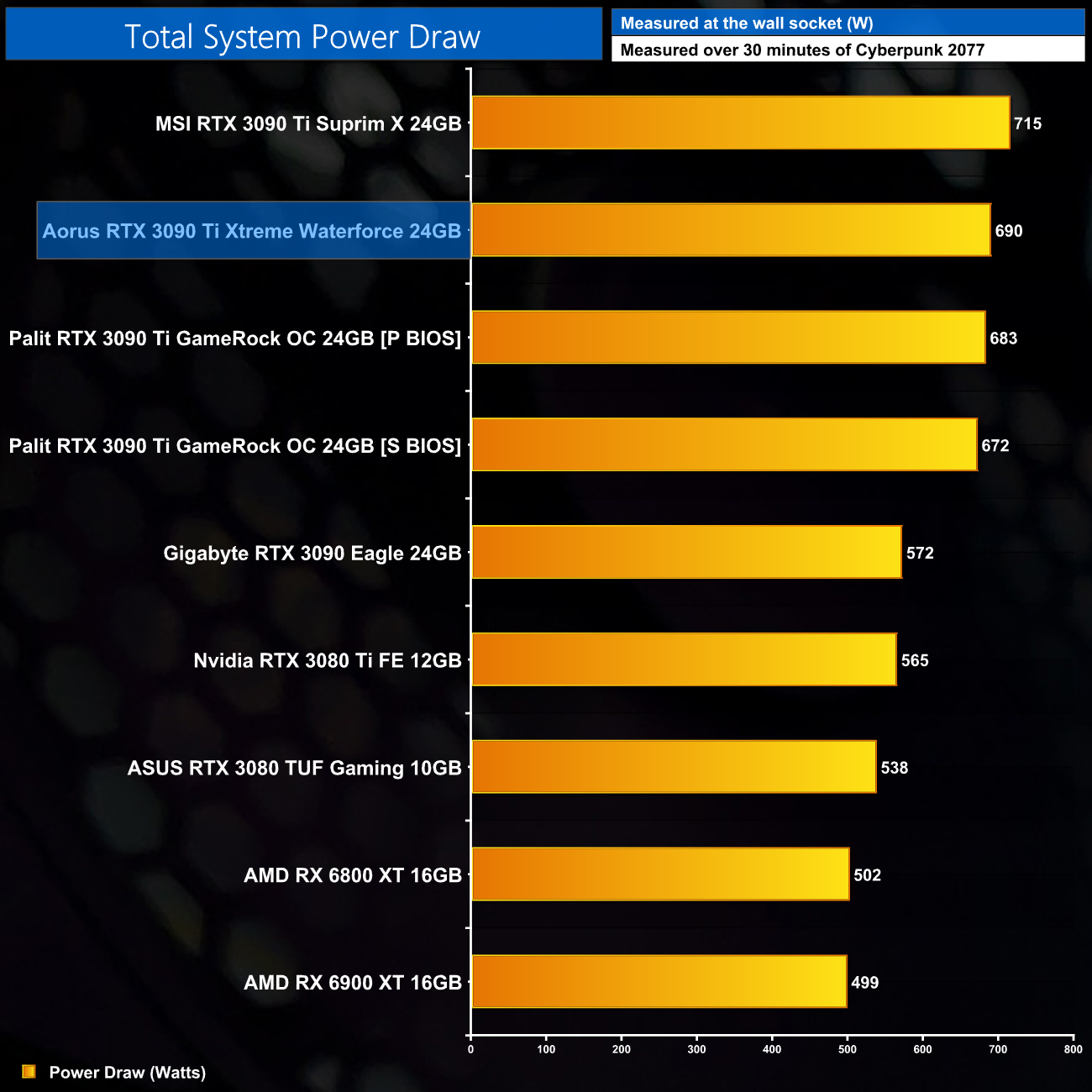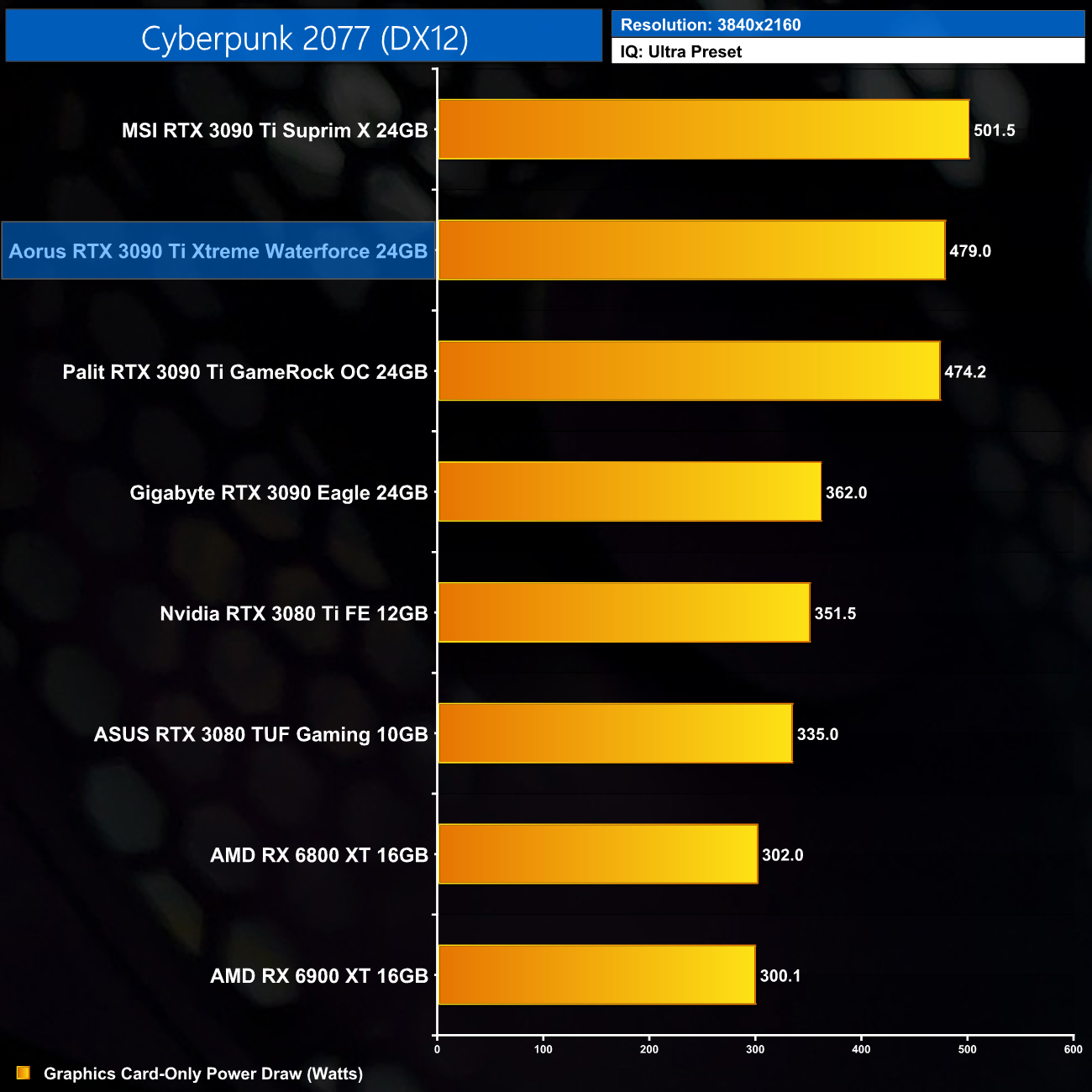 As for graphics card-only power draw, the Xtreme Waterforce has a 480W power target and it is pretty much bang on with that figure when testing in Cyberpunk 2077, so interestingly it is actually slightly more efficient than the MSI Suprim X.