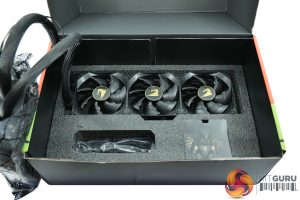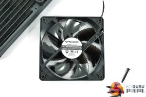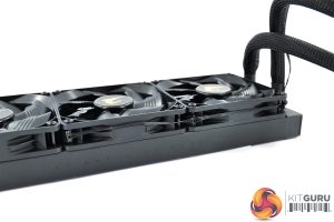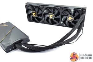 The only other thing about the fans is that, by default, they are mounted to the underside, or tube-side, of the radiator, suggest that Gigabyte intends for the radiator to be installed in the roof of your case. Of course, you can unscrew the fans and flip them around like I did, so they’re intaking from the front of the chassis.