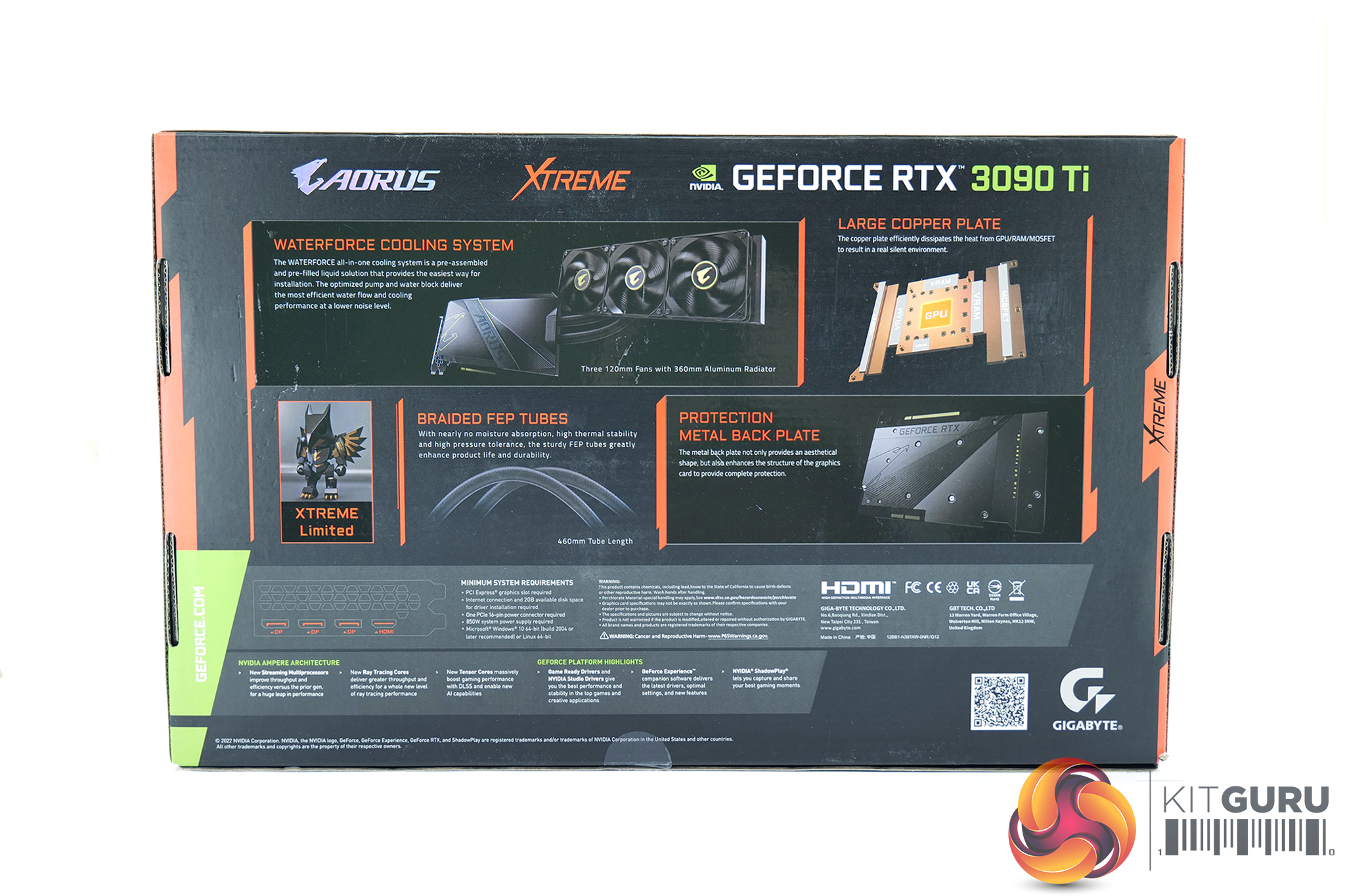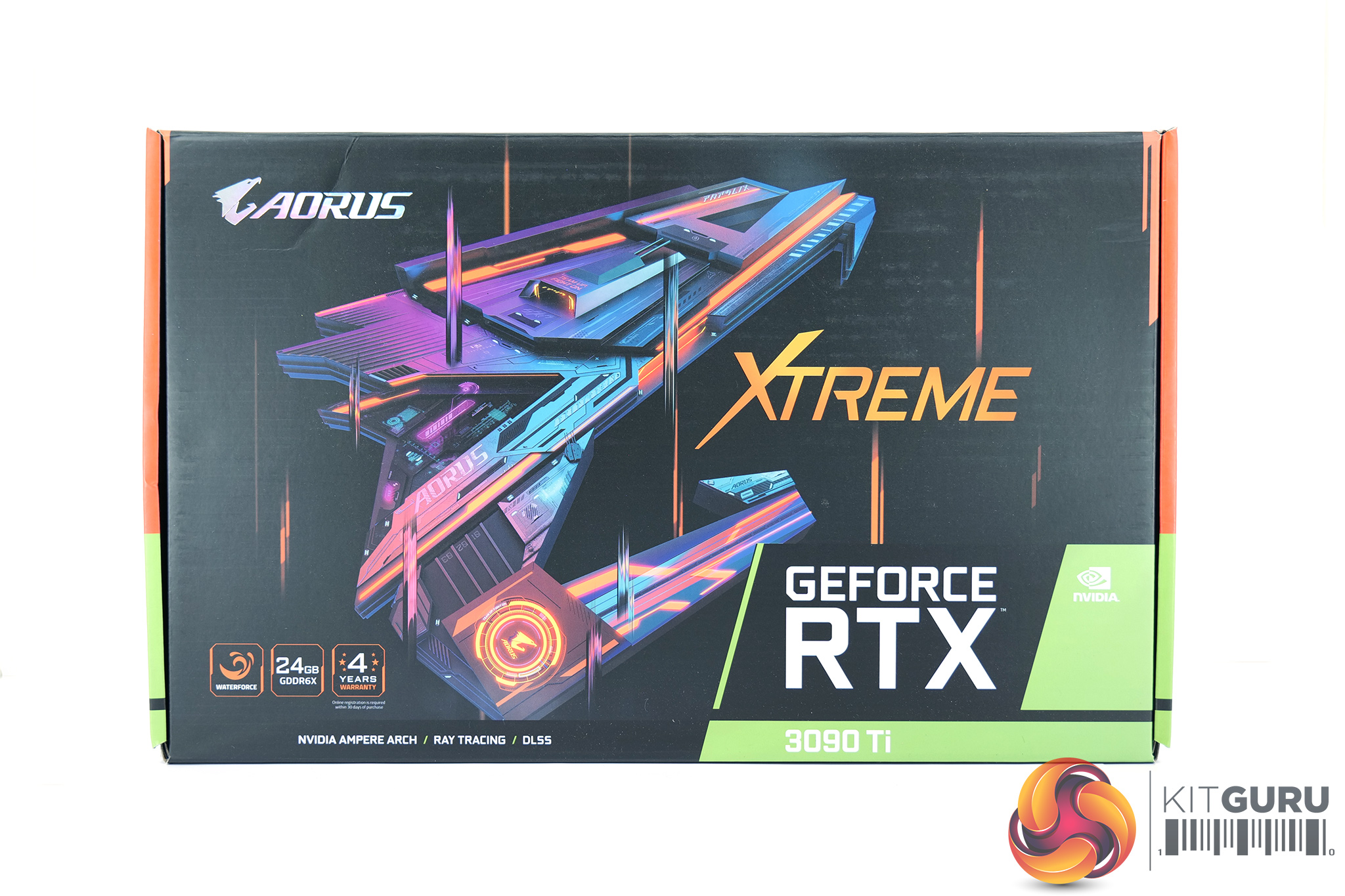 The Gigabyte Aorus RTX 3090 Ti Xtreme Waterforce ships in a large black box, with a large Aorus logo on the front and various key features of the card visible on the back.