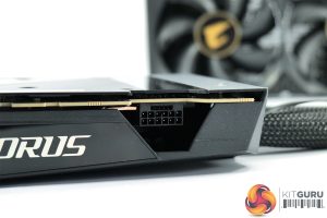 As for the card’s design and the cooler setup, we have a pretty stealthy overall look. Everything is entirely black, with just some gold accents in the form of the Aorus logo. The card’s shroud is made out of plastic with one brushed metal section, while there is a full-length metal backplate too.