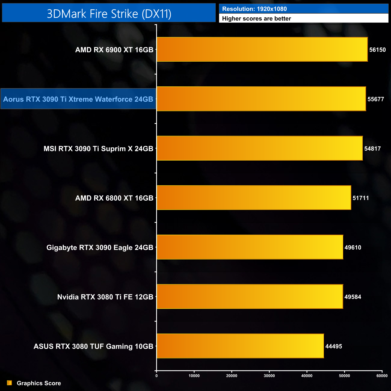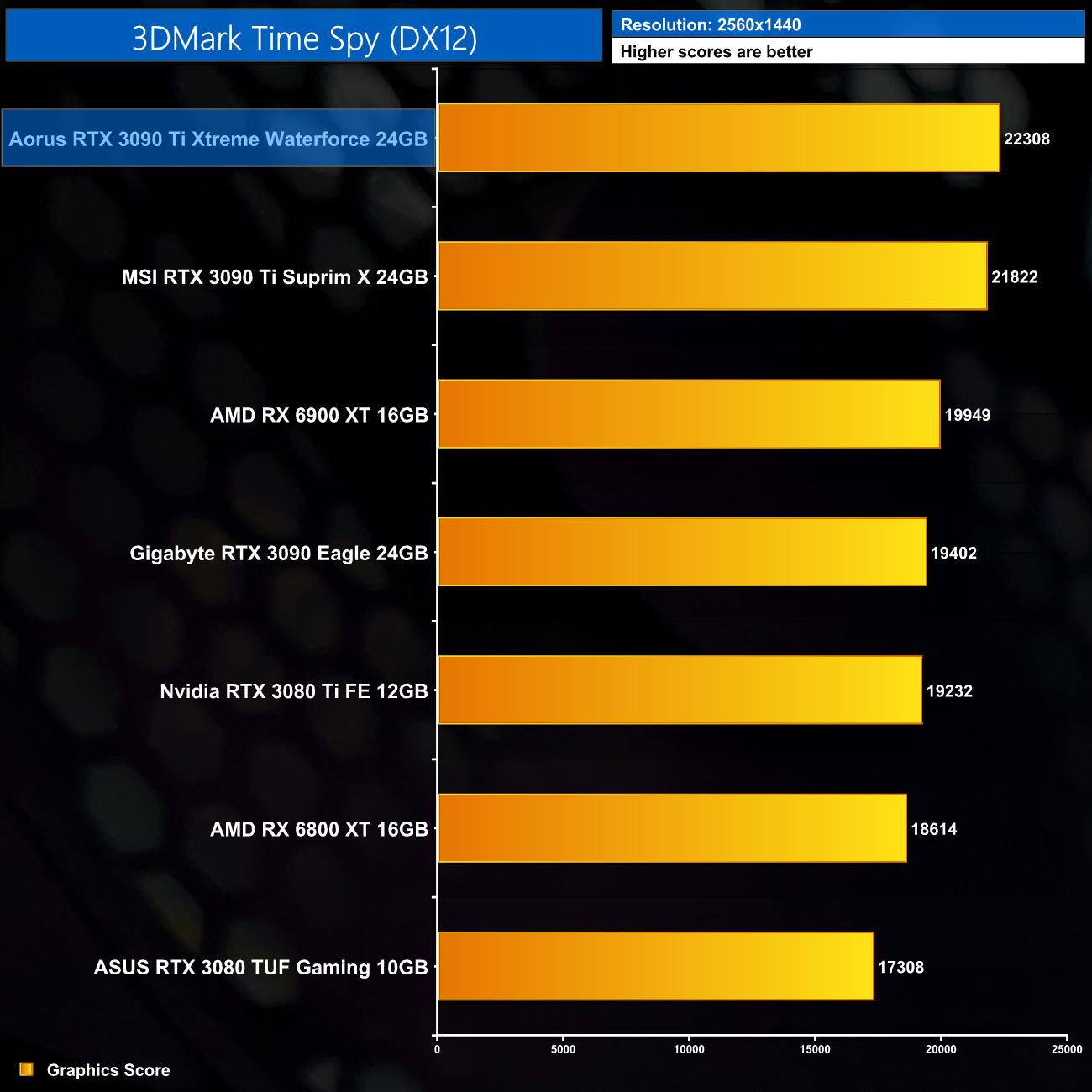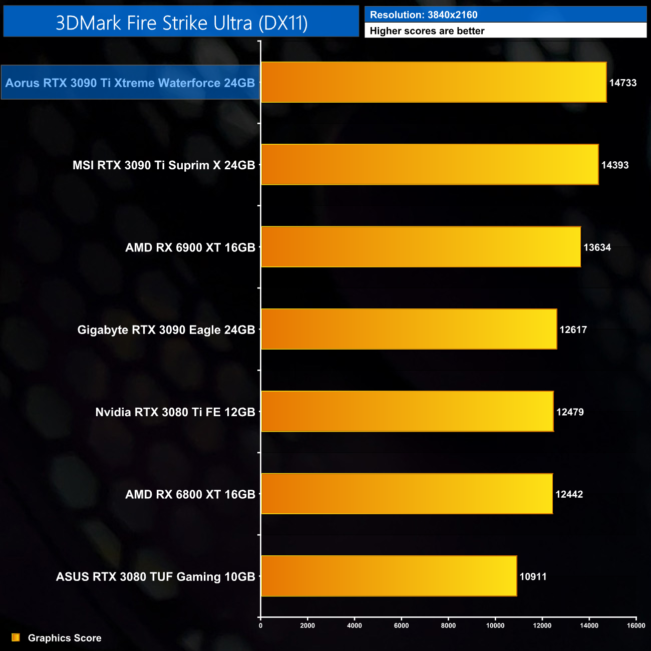 Kicking off with our 3DMark testing, we can see the Aorus RTX 3090 Ti Xtreme Waterforce out-scores the MSI RTX 3090 Ti Suprim X and Palit RTX 3090 Ti GameRock OC in every single benchmark. It's still just behind the RX 6900 XT in Fire Strike, but storms ahead in Time Spy and Fire Strike Ultra.