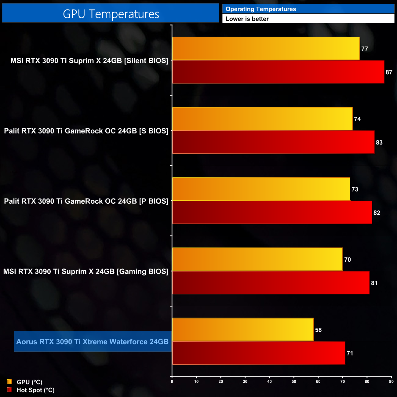 As for thermal testing, even considering the massive 480W power limit, we’d hope that the Aorus Xtreme will run cool thanks to its 360mm AIO liquid cooler, and I am pretty happy with these results. We saw a peak GPU temperature of 58C, while the hot spot hit 71C, easily making this the coolest-running RTX 3090 Ti we have tested so far.