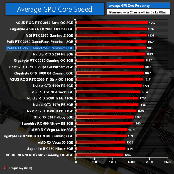 While its rated boost clock is 1815MHz, GPU Boost 4.0 ensures that the Palit RTX 2070 actually averages just over 1900MHz under load. This is 28MHz slower than the MSI Gaming Z, though, and that small gap explains why we were seeing the MSI card post marginally higher framerates across our suite of games.