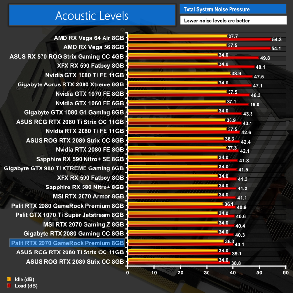 Following on from the excellent thermal results, the Palit card really impresses with noise levels too – it is barely 40dB loud, again making it one of the best results we have seen. In fairness, you are unlikely to tell the difference between a card emitting 40 or 41dB, but we can only go with what our sound meter tells us – this is a very quiet card.