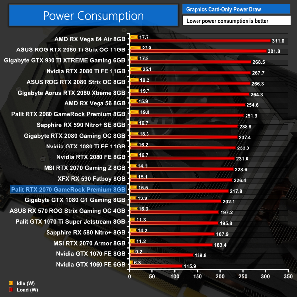 Power consumption is pretty much as expected from an overclocked RTX 2070, with the card drawing almost 220W when running 3DMark Fire Strike Ultra. This is about 10W less than the Gaming Z, but about 35W more than the stock-clocked Armor 8G 2070.