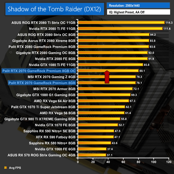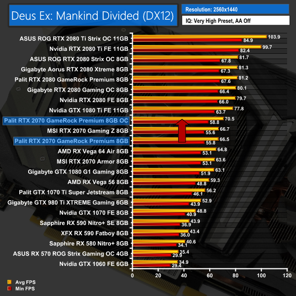 This isn't the biggest overclock we've been able to dial in on an RTX card, but the core is already significantly faster than reference speeds. Still, our Fire Strike score increased by almost 5%, and we also gained an extra 4FPS playing Deus Ex and Shadow of the Tomb Raider at 1440p.