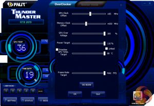 When overclocking the GameRock Premium, we used Thunder Master – Palit's dedicated tool. We settled with +85MHz to the GPU and +650MHz to the memory. +105MHz was stable in Time Spy, but caused crashes with Shadow of the Tomb Raider, so we had to dial it back.