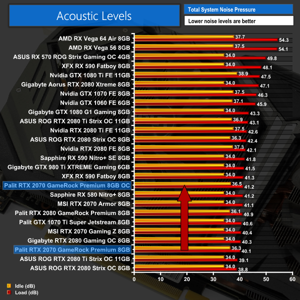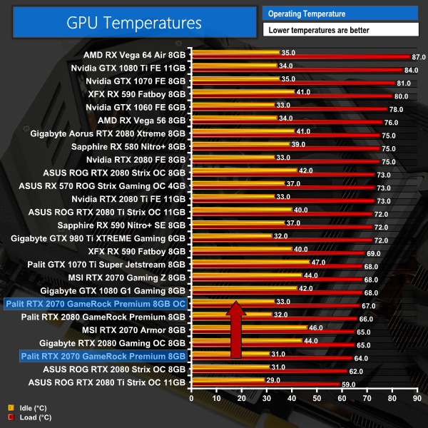 The Palit was able to handle this overclock very well. Temperatures rose 3C to 67C, which is still a very good result, while noise levels rose just over 1dB – though it would be very hard to notice the difference in the real world. Power consumption jumped up by around 28W, too, but again that is hardly cause for concern.