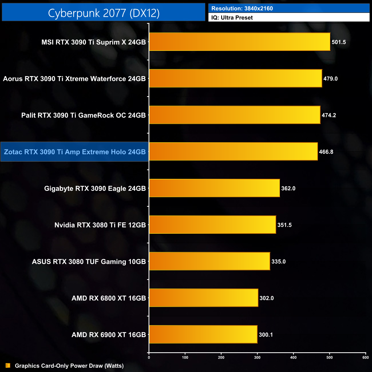 Despite the 450W power target, we actually saw the Amp Extreme Holo exceed that value, drawing just under 467W in Cyberpunk 2077. It's still the most frugal RTX 3090 Ti we've tested, but not by a lot.