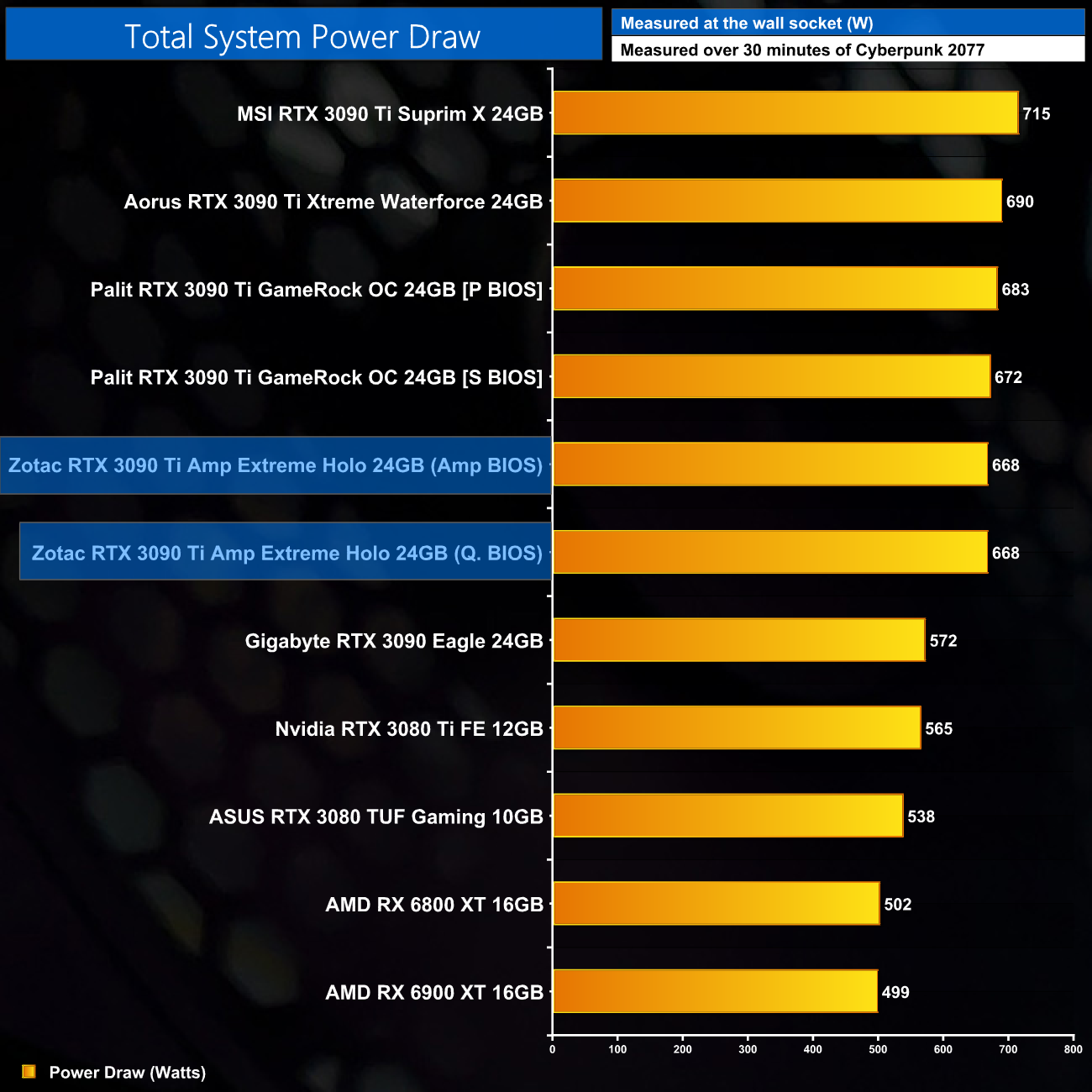 Of the four RTX 3090 Tis we have now tested, the Amp Extreme Holo has the lowest power target of them all, so understandably its total system power is the lowest. It's still very high, mind you, coming in just shy of 670W, so you will still need a very decent PSU.