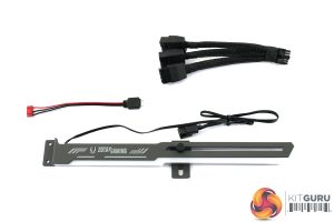 Inside, we get a bunch of leaflets and documentation, as well as a couple of stickers. More interesting is the GPU support bracket, which is RGB-equipped, and a power adaptor is also included for the PCIe Gen5 16-pin header that is used on the card.