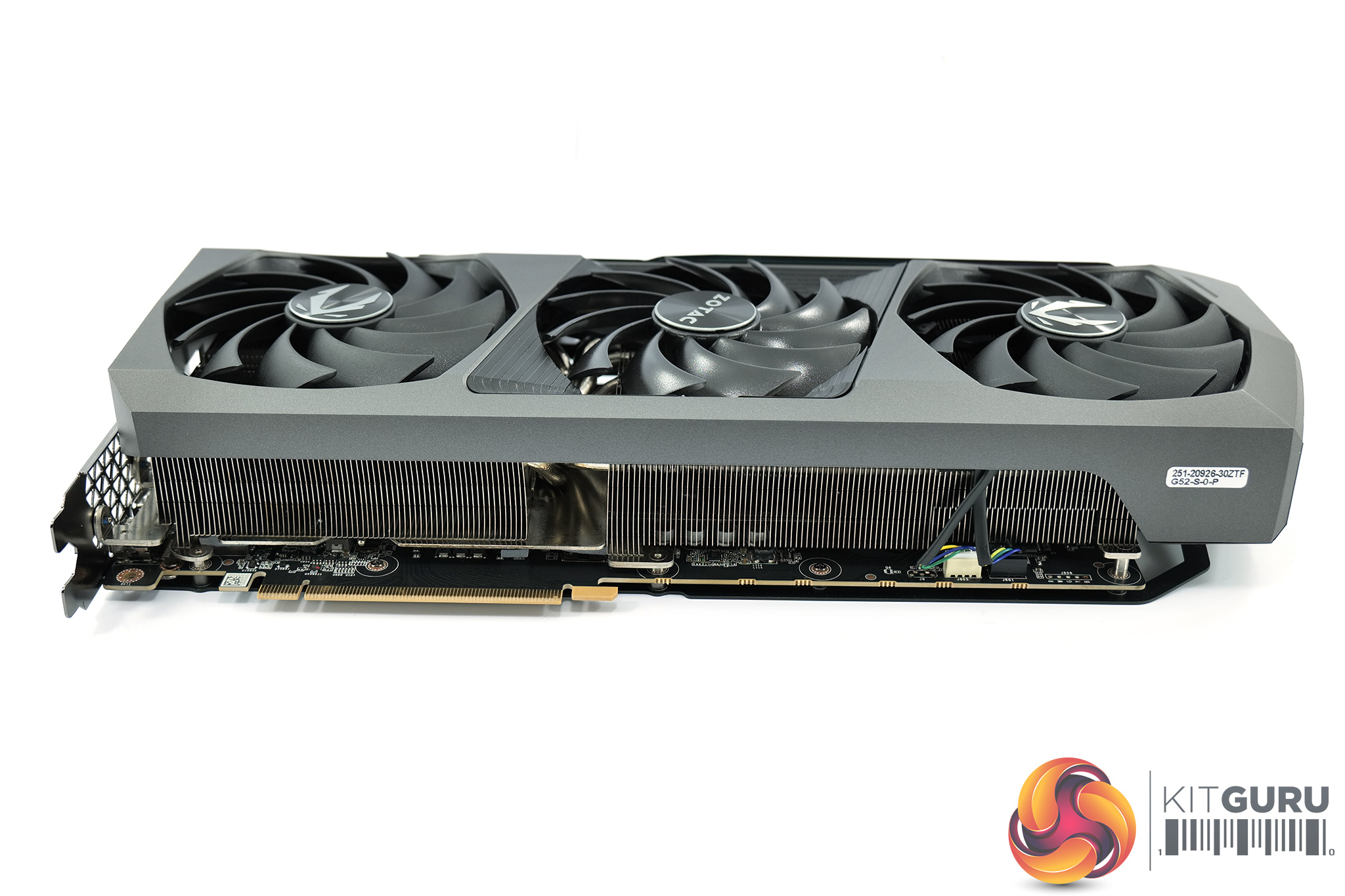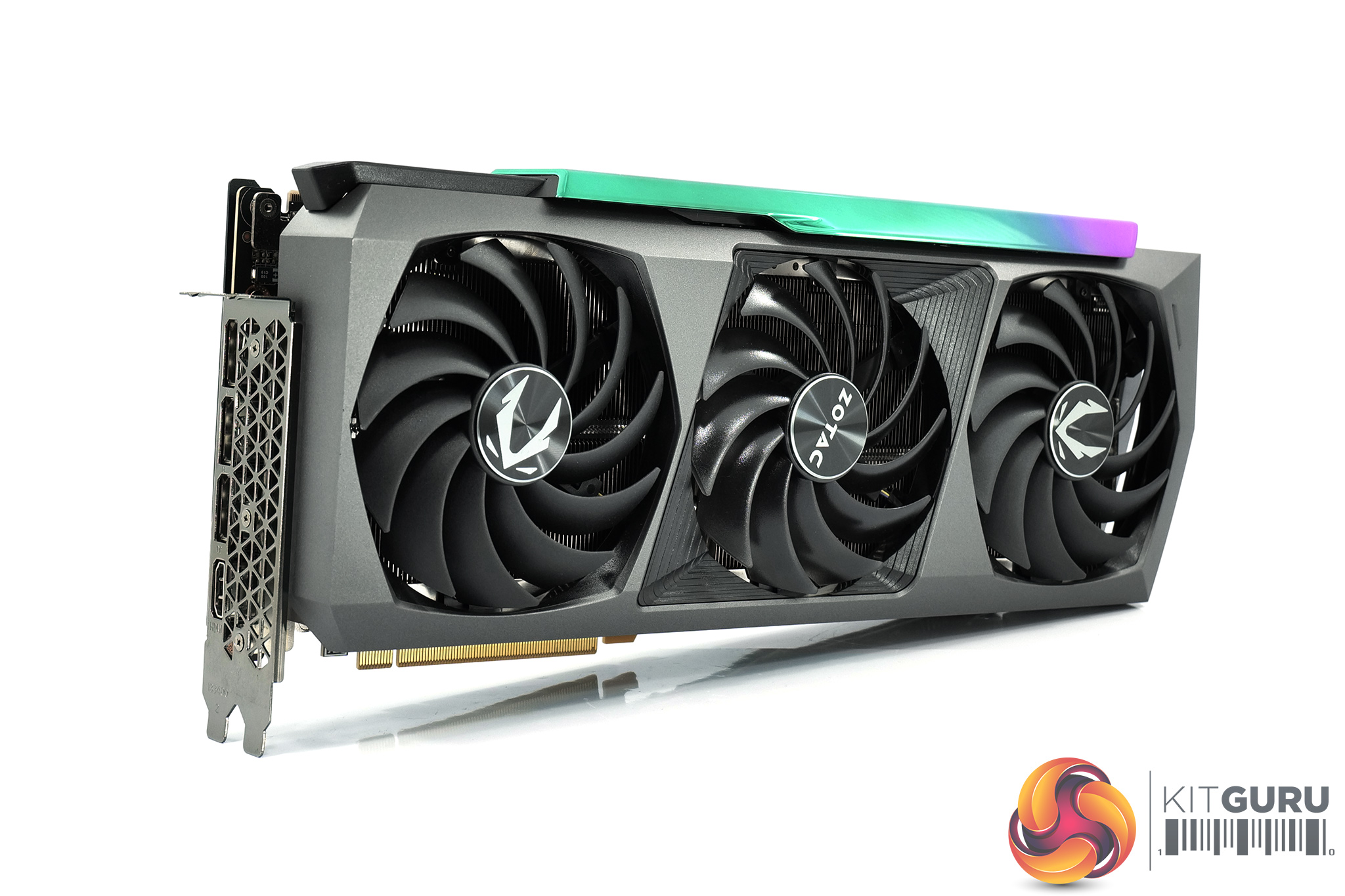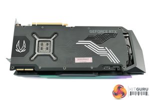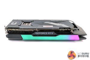 Here we get another good look at the holographic section on the card, while we can also note the metal backplate that is used. This features two RGB lighting sections – the Zotac logo on the left side, as well as the angular LED strips over towards the end of the card.