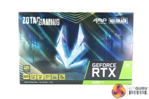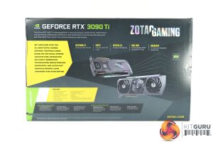 The Zotac RTX 3090 Ti Amp Extreme Holo ships in an attractive blue box, with the Zotac logo taking pride of place in the middle.