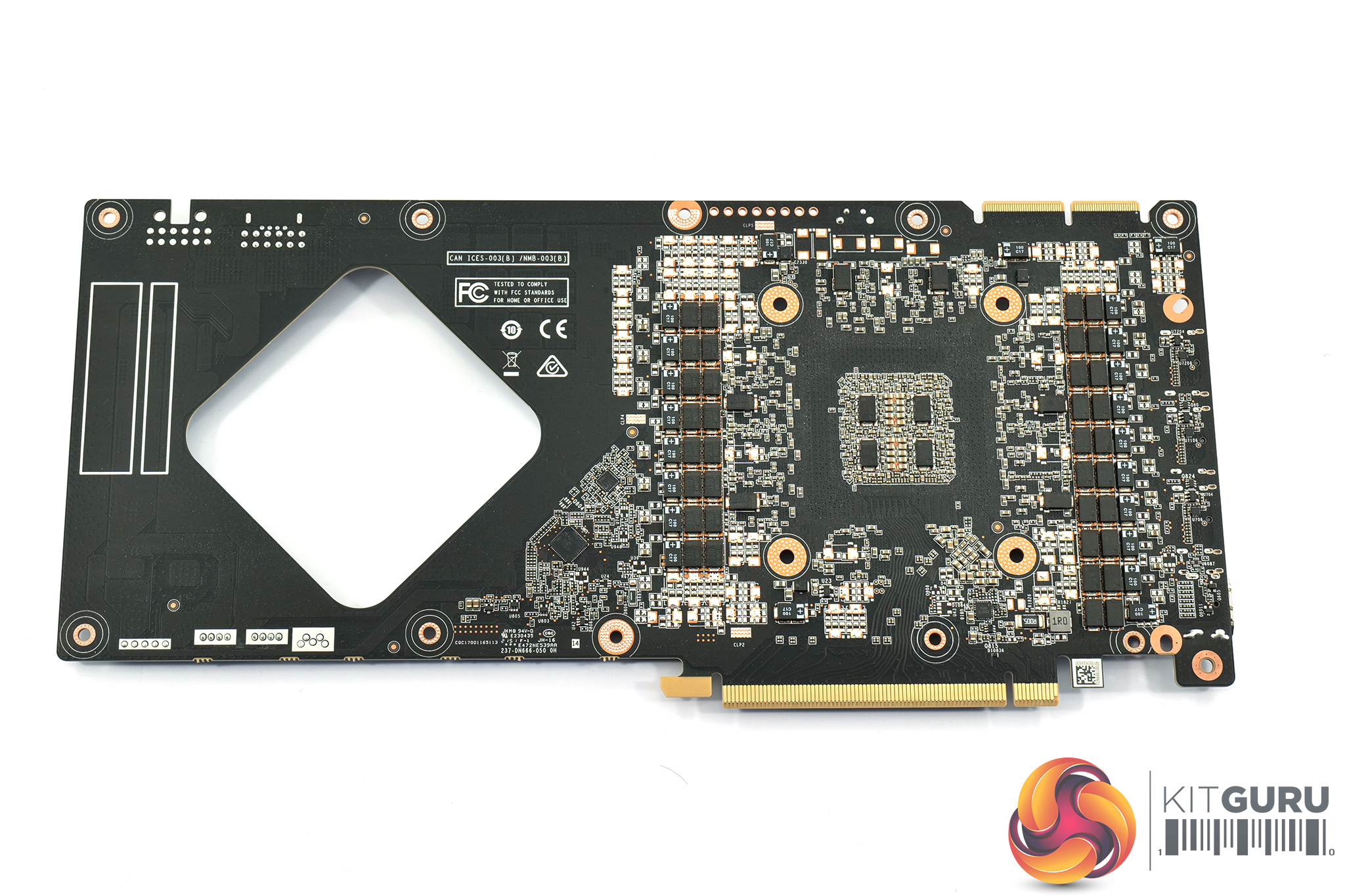 Opening up the card to look at the PCB, the first thing to note is the unusual diamond-shaped cut-out in the PCB itself – there's just a big hole to the right of the GPU and memory chips. In theory this would allow for airflow to pass straight through the heatsink and PCB, but Zotac has mystifyingly blocked this cut-out with the card's backplate, allowing on a very small amount of airflow out thanks to a few tiny cut-outs in the metal.