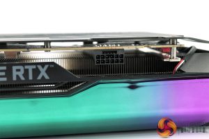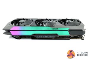 Taking a look at the card itself, as we mentioned on the first page, the design is very similar to the RTX 3090 Amp Extreme Holo. Zotac is using a dark grey plastic shroud, but your eye has probably been drawn by the holographic plastic section on the top of the card – this is one of the card's RGB zones, as shown below.