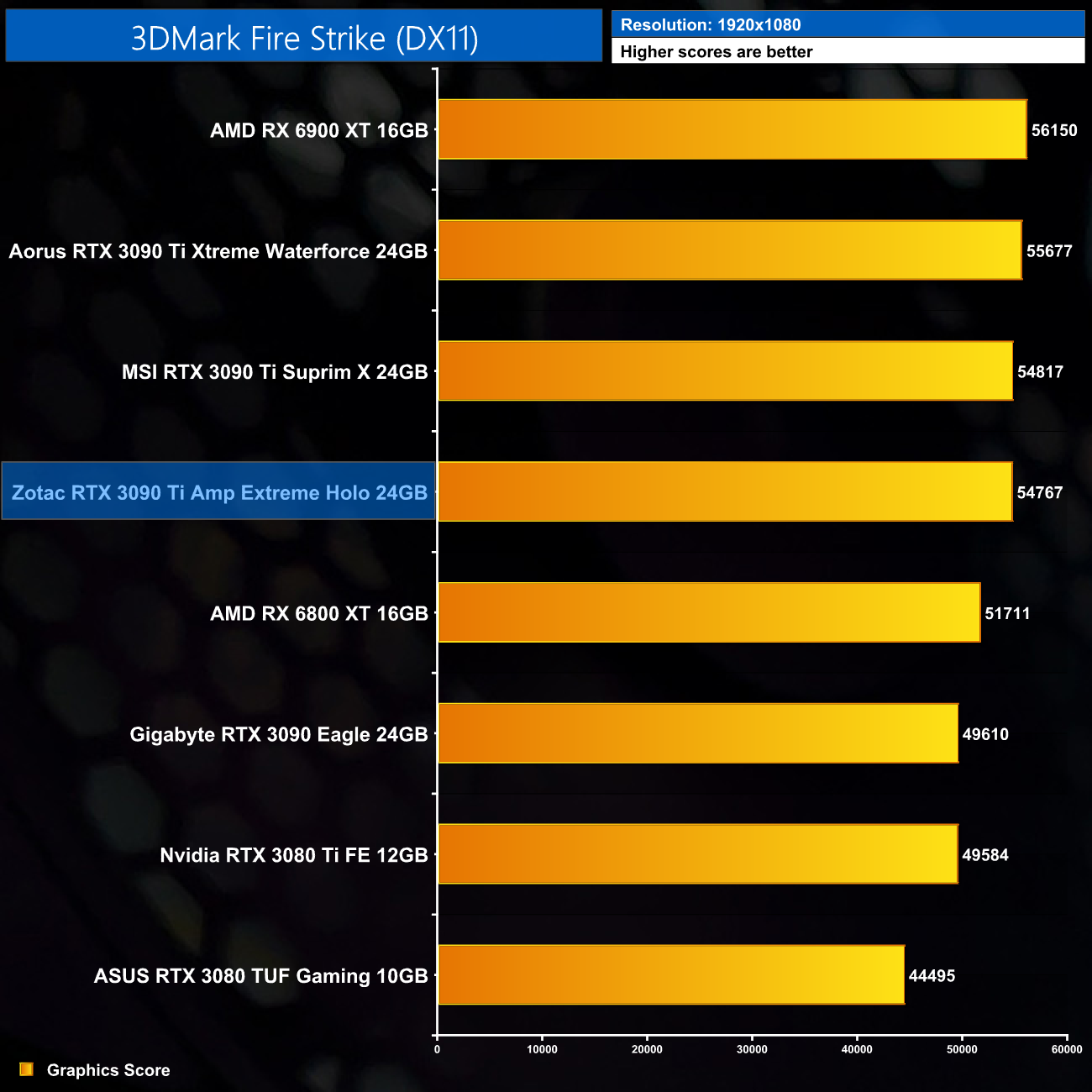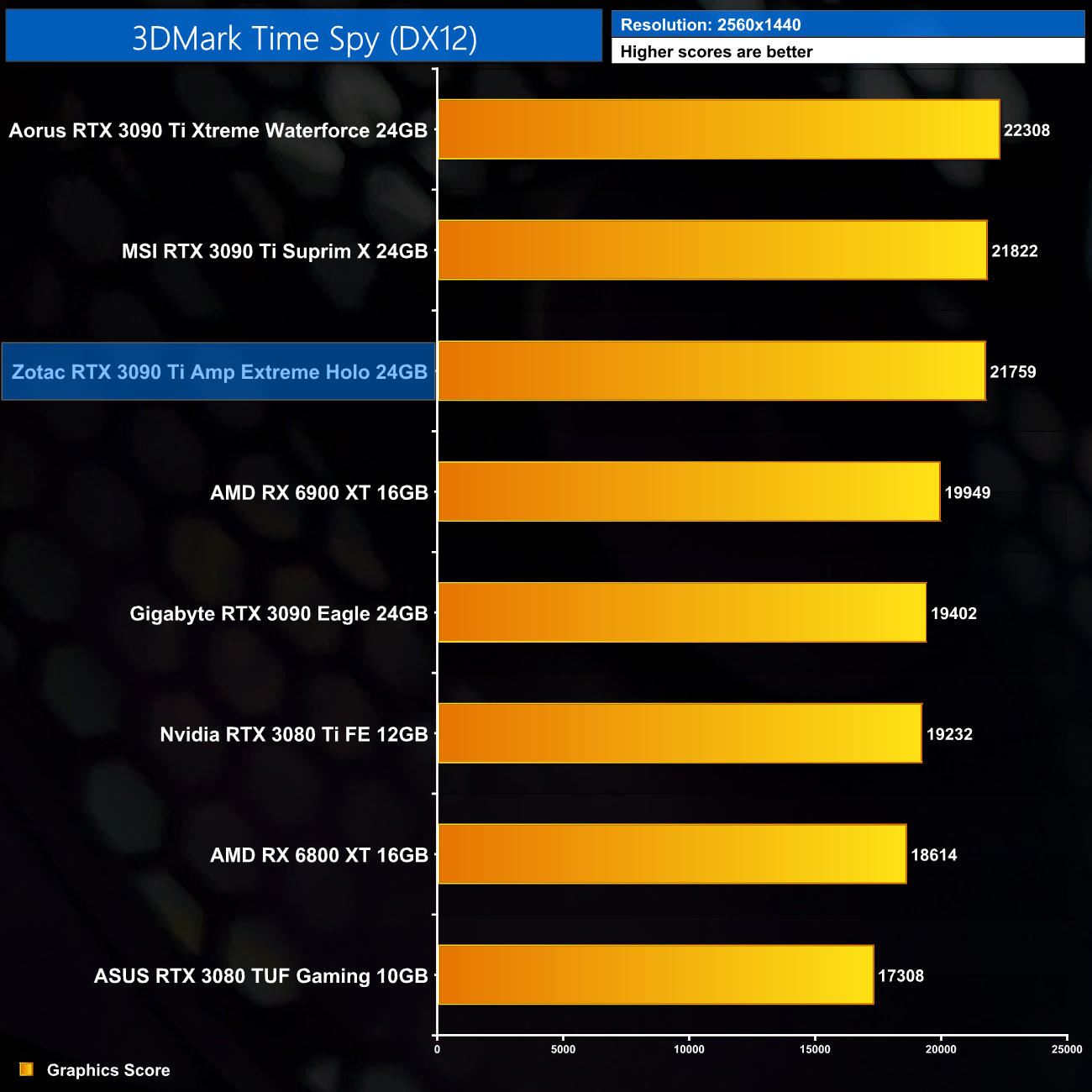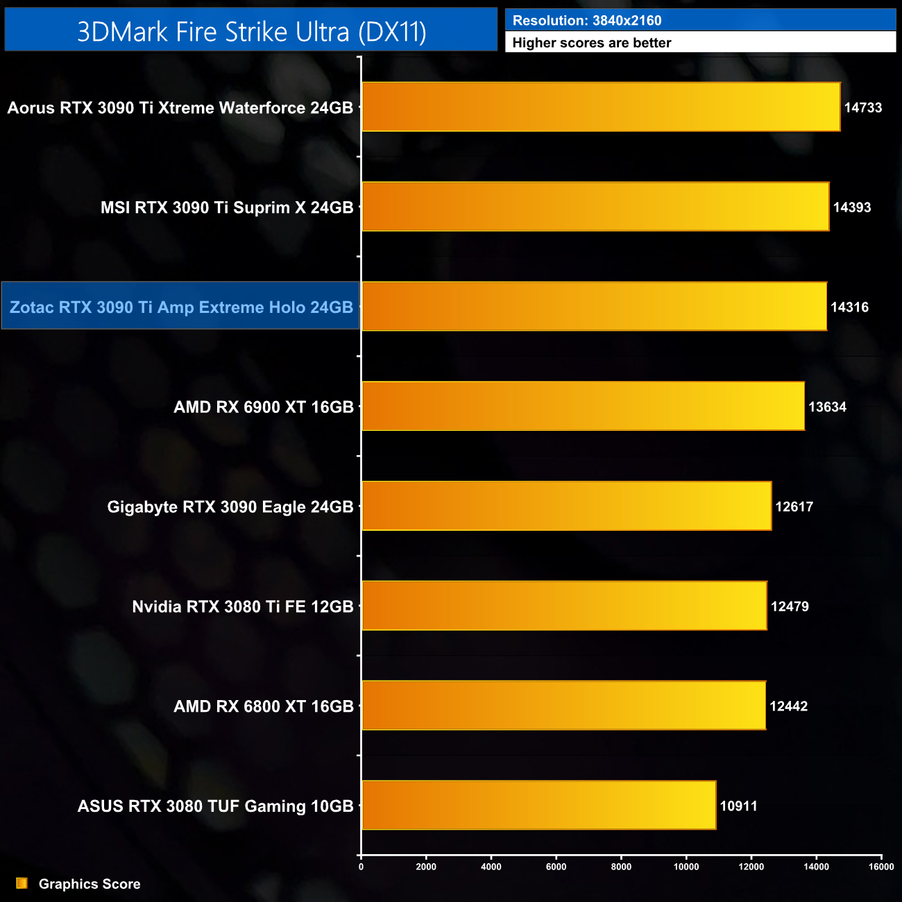 Kicking off with our 3DMark benchmarks, the results here are as expected. The Amp Extreme Holo is delivering almost identical scores to the MSI Suprim X, coming within a single percentage point of that card in all three benchmarks shown.