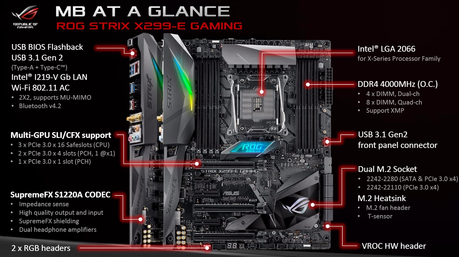 Finally, ASUS also unveiled a slew of new motherboards, ranging from the flagship Rampage VI Extreme, to the Rampage VI Apex, both of which are based on Intel's new X299 chipset for its upcoming Core X-series CPUs. The Rampage Apex has a focus on achieving record-breaking overclocks while using sub-zero cooling. There is also the new X299-E motherboard on the way, which you can see in the images above.
