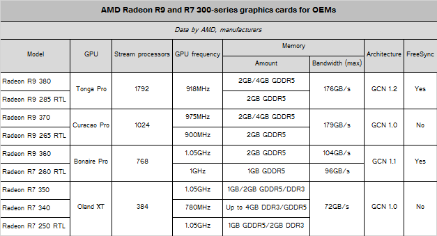 The whole AMD Radeon R9 and R7 300-series products lineup for OEMs is based on well-known “Tonga”, “Curacao”, “Bonaire” and “Oland” graphics processing units, reports TechReport web-site. The “new” graphics cards for system makers have a lot in common with already available AMD Radeon R9 200-series graphic boards sold in retail (see the table below, current-gen solutions are marked as “RTL”).
