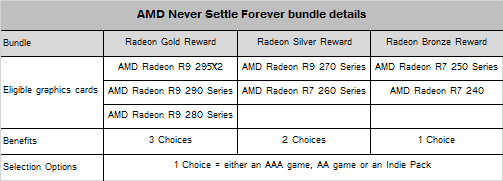 Depending on the Radeon graphics card, gamers are now eligible to receive up to three AAA/AA games with high-end Radeon R9 graphics boards, two games with mainstream Radeon R9 or R7 offerings and one game with an entry-level Radeon R7 graphics boards based on GCN architecture. Instead of one high-end title, users can get a pack of games from independent developers.