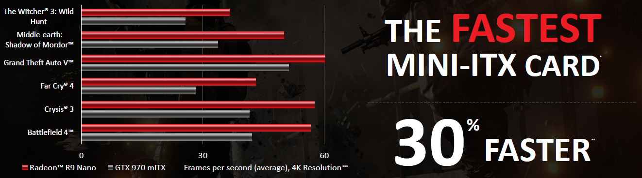 According to AMD, the Radeon R9 Nano is at least 30 per cent faster than any mini-ITX graphics card available today (i.e., Nvidia GeForce GTX 970) in various games in ultra-high-definition 4K (3840*2160) resolution. Thanks to ultimate compute performance of the novelty, that difference will only increase over time as games take advantage of compute capabilities of GPUs.