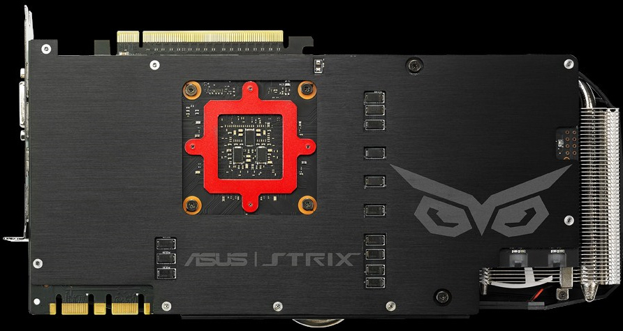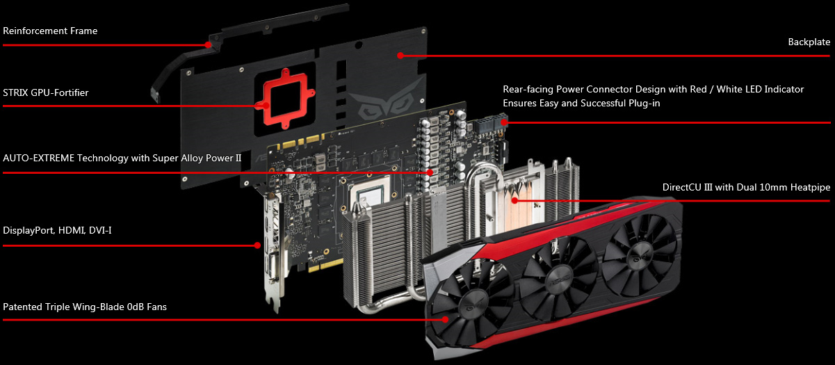 The new graphics card from Asus uses DirectCU III cooling system with three fans as well as multiple heatpipes, including two 10mm pipes and two regular pipes. The new fans utilized on the DirectCU III feature new wing-blade design that delivers maximum air flow and improved 105% static pressure over the heat sink, while producing less noise compared to standard fans. According to Asus, the DirectCU III transports 40% more heat away from the GPU and outperforms reference designs, achieving up to 30% lower temperatures during gaming. The graphics board features reinforcement frame, a backplate and even a special GPU fortifier frame designed to prevent PCB from bending over time.