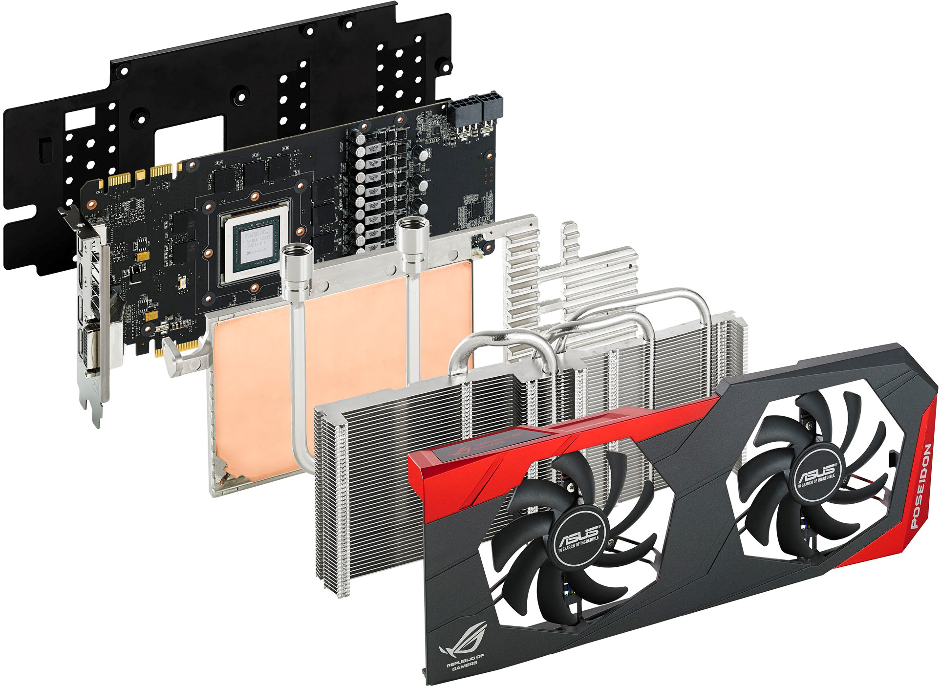 The Asus ROG Poseidon GTX 980 features a cooling system that features a custom copper waterblock (that is in direct contact with the GPU), which allows plugging tubes (using standard G¼-inch threaded fittings) from custom liquid-cooling systems, as well as a massive aluminium radiator with ultra-thin fins with heat-pipes. According to Asustek, with water-cooling, ROG Poseidon GTX 980 achieves up to 27°C-lower running temperatures than reference designs. With air-cooling, ROG Poseidon GTX 980 is also significantly cooler than graphics cards, which use Nvidia’s reference cooling systems.