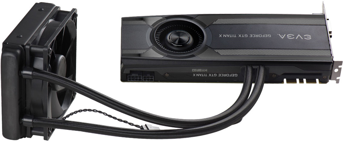The EVGA GeForce GTX Titan X Hybrid graphics card will hit the market shortly. The company will sell the adapter for $1099. The EVGA all-in-one hybrid liquid cooling system for GeForce GTX Titan X boards is available separately for $109.