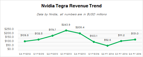 “The Tegra Processor business decreased by $366 million due to decreases in our Tegra 3 line of smartphones and Android and Surface tablets,” said Colette Kress, chief financial officer of Nvidia, in her commentary on financial results. “These declines were partially offset by strength of our growing line of products for Tegra 4 smartphones, tablets, and other devices as well as infotainment systems for automobiles.”