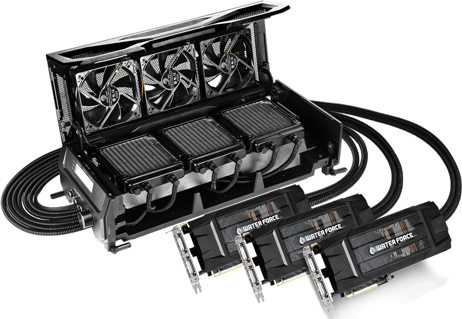 Designed to deliver ultimate framerates in the latest games in ultra-high-definition resolutions, the Gigabyte GeForce GTX 980 WaterForce 3-way SLI (GV-N980X3WA-4GD) graphics board kit features default GPU clock-rates of 1228MHz/1329MHz (base/boost). Each graphics card sports 4GB of GDDR5 memory at 7GHz, three DisplayPort, one HDMI and two DVI outputs.