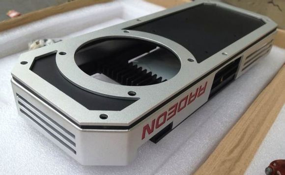 The cooling system, which resembles that of AMD Radeon R9 295X2, features a place for a fan as well as openings to connect a liquid loop. The cooler has the “Radeon” trademark imprinted on it. The cooler seems to be made of aluminum, or a similar metal. The new liquid cooling system is designed to cool-down a single-chip graphics card, which is why the place for the fan is located on a side of the board.