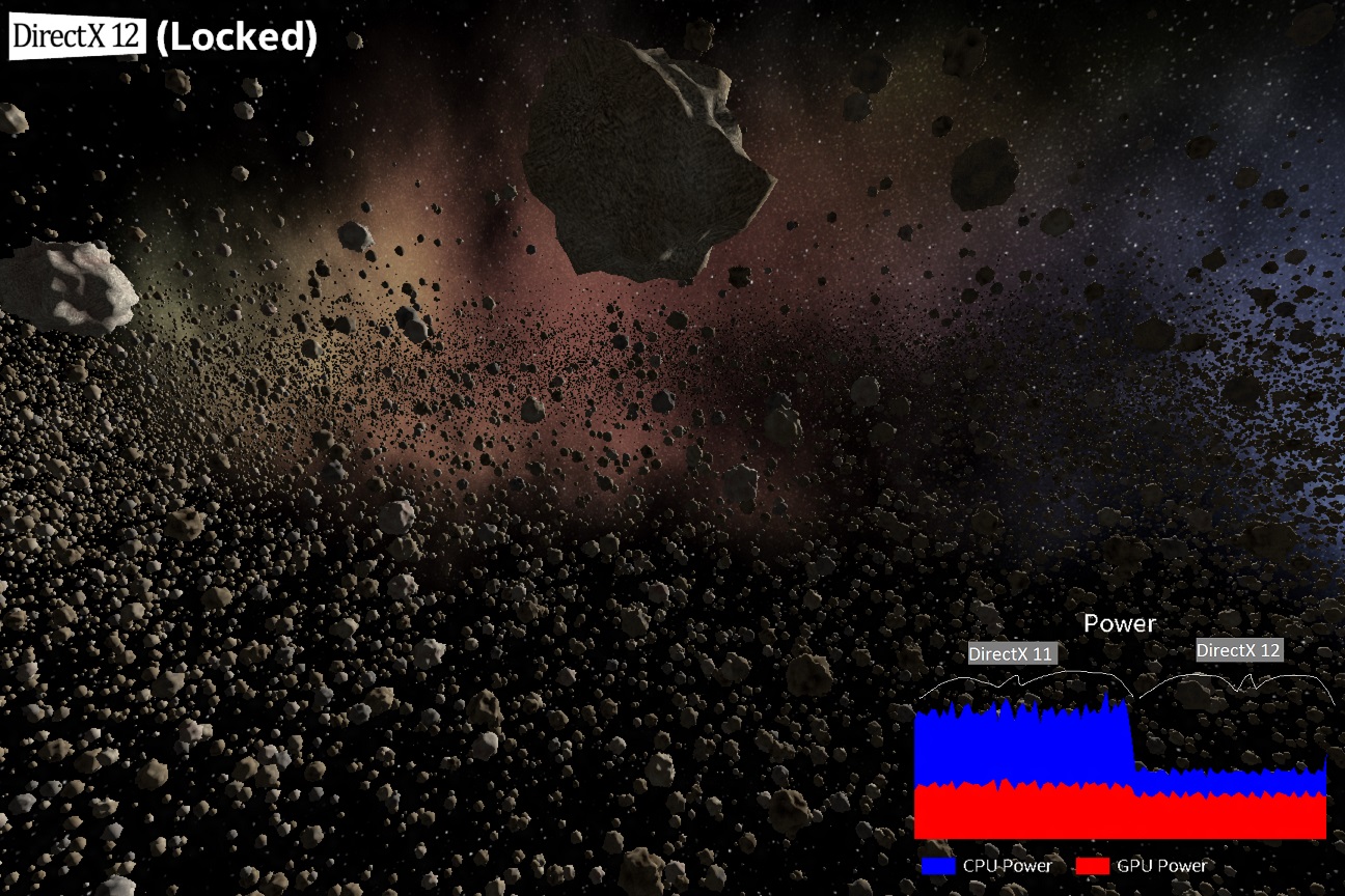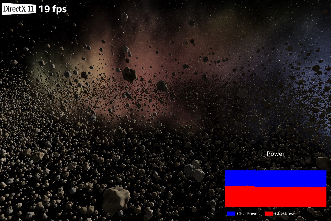 In the demo Intel renders a scene of 50,000 fully dynamic and unique asteroids in one of two modes: maximum performance and maximum power saving. The application can switch between the DirectX 11 and DirectX 12 APIs. The hardware used was a Microsoft Surface Pro 3 tablet with an Intel Core i-series “Haswell” processor.