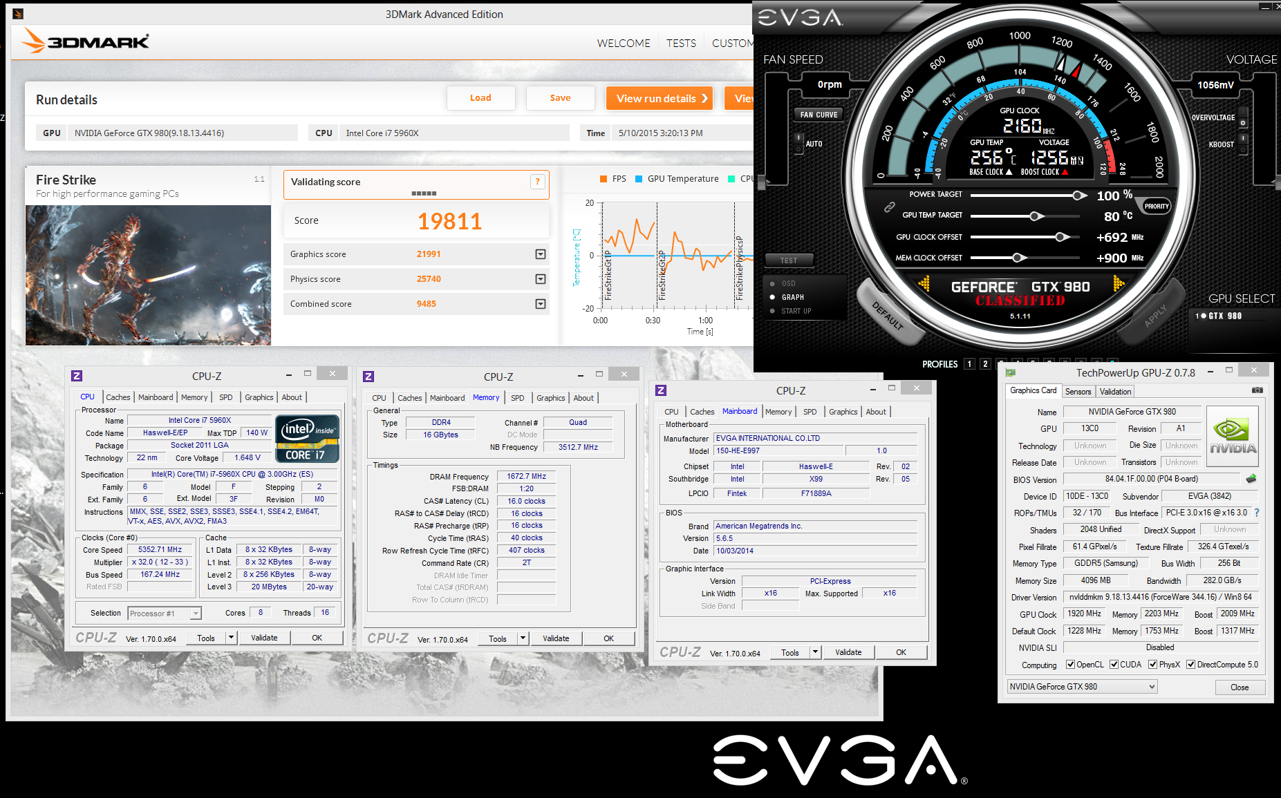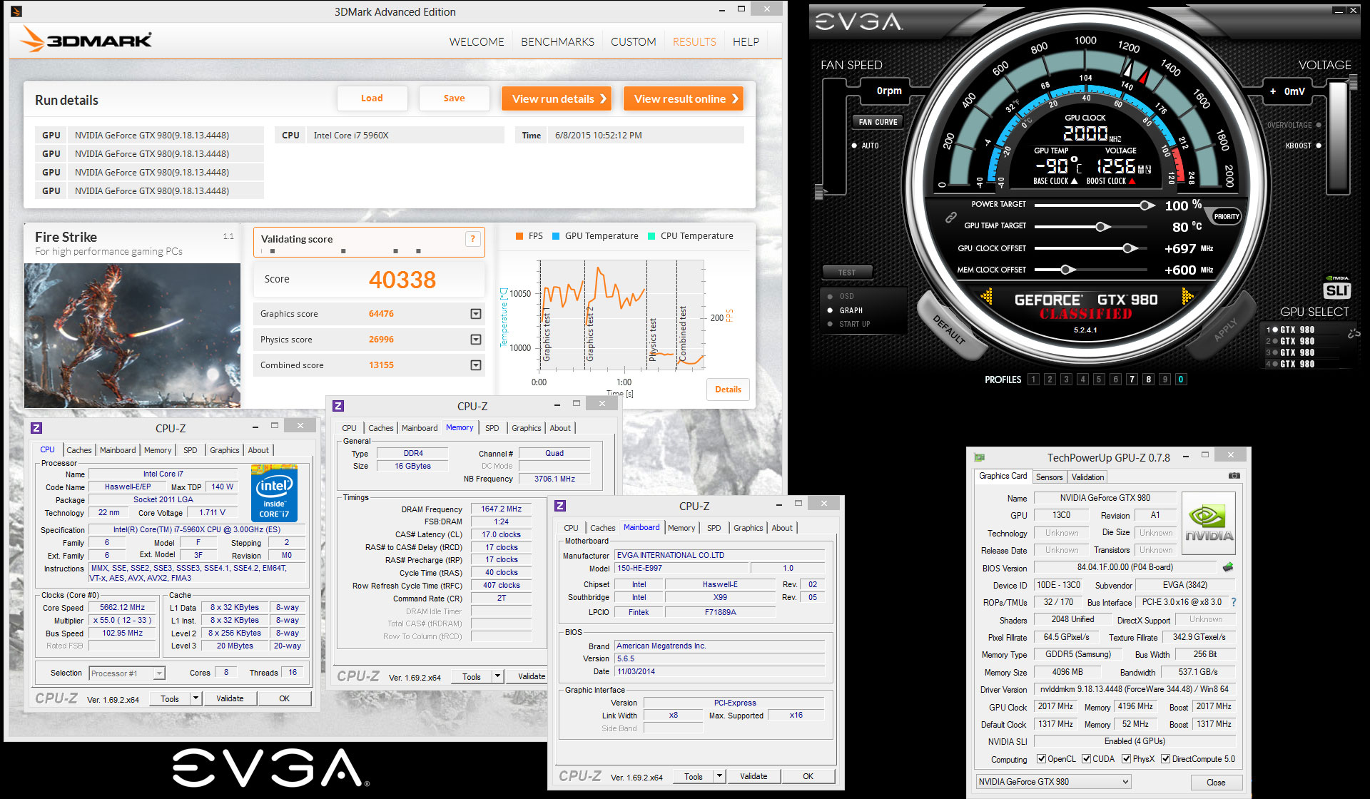 Using four EVGA GeForce GTX 980 Classified ACX 2.0 4GB graphics cards overclocked to 2.0GHz/8400MHz (GPU/memory) and cooled-down using liquid nitrogen (LN2) as well as a test-bed equipped with an Intel Core i7-5960X processor clocked at 5.6GHz, an EVGA X99 mainboard and 16GB of 3.30GHz DDR4 memory, Vince “K|NGP|N” Lucido managed to set three absolute world records in 3DMark FireStrike benchmark: