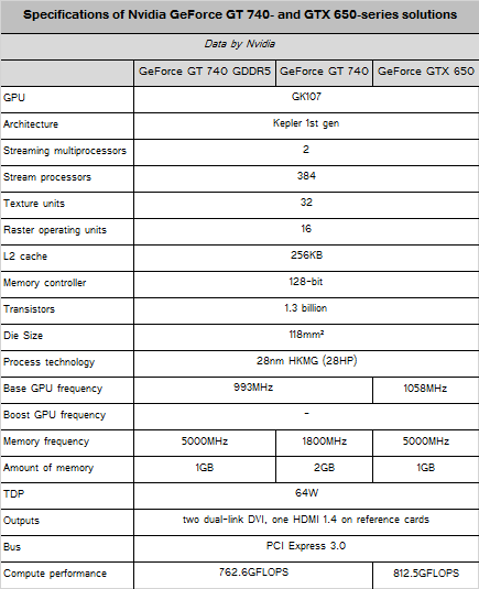 Specifications of the GeForce GT 740 graphics boards resemble those of the GeForce GTX 650, which is not surprising because they are powered by the same silicon. Since Nvidia-recommended clock-rates for the GT 740 chip are lower compared to those of the GTX 650, the majority of the GeForce GT 740-based offerings from various manufacturers of graphics adapters will be factory-overclocked.